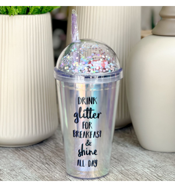 Com o Copo Degradê Mod.1, suas bebidas ganham um toque de estilo único. O degradê delicado e a frase inspiradora "Drink Glitter for Breakfast and Shine All Day" criam uma experiência visual encantadora. Com 450ml de capacidade, este copo une design moderno e funcionalidade, garantindo que você brilhe em todos os momentos.
