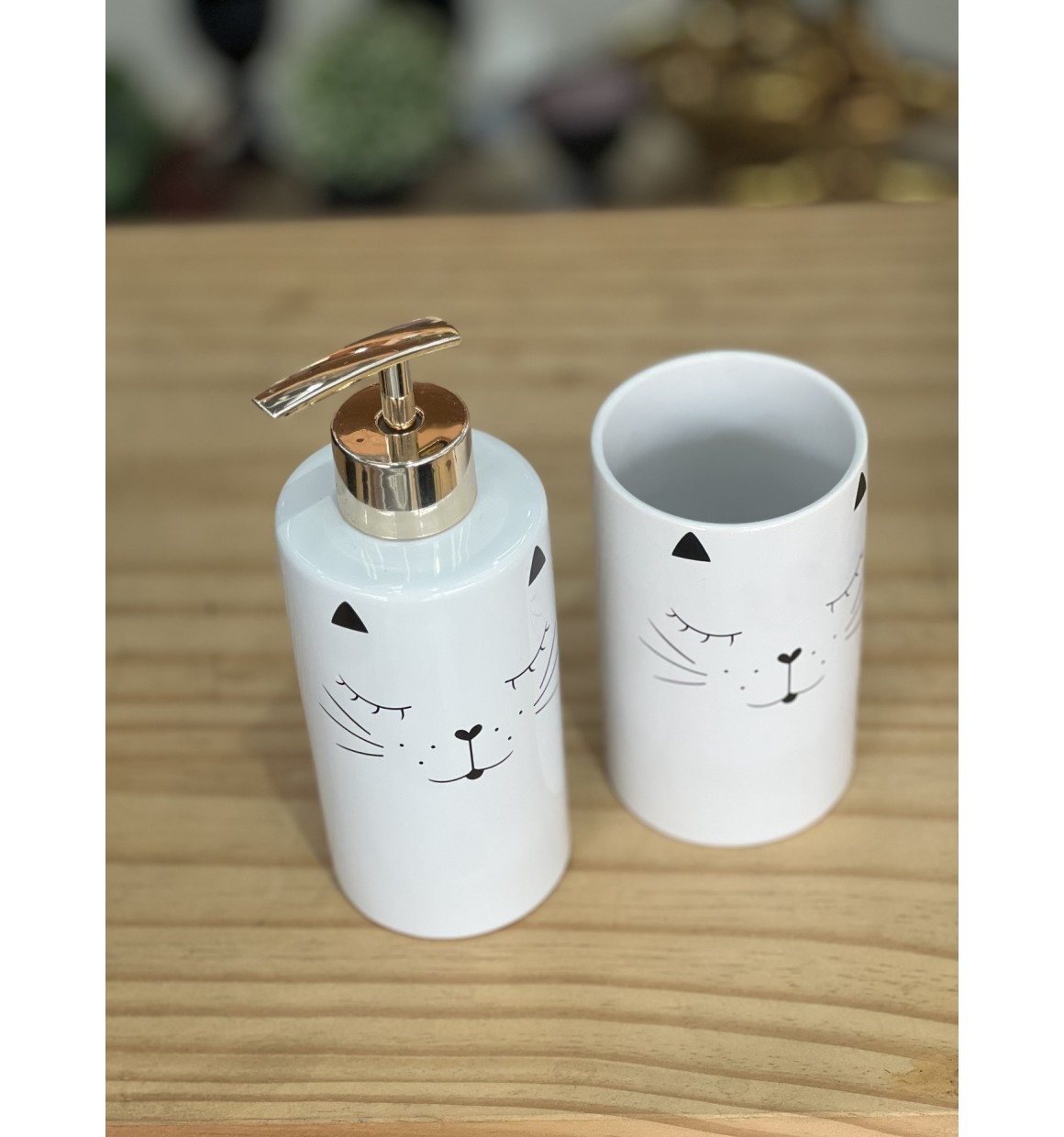 Este kit de porcelana com estampa de gatinho é puro charme. Com um porta-sabonete líquido com Tampa dourado de 300ml e um porta-objetos multiuso, ele combina praticidade e estilo na medida certa.