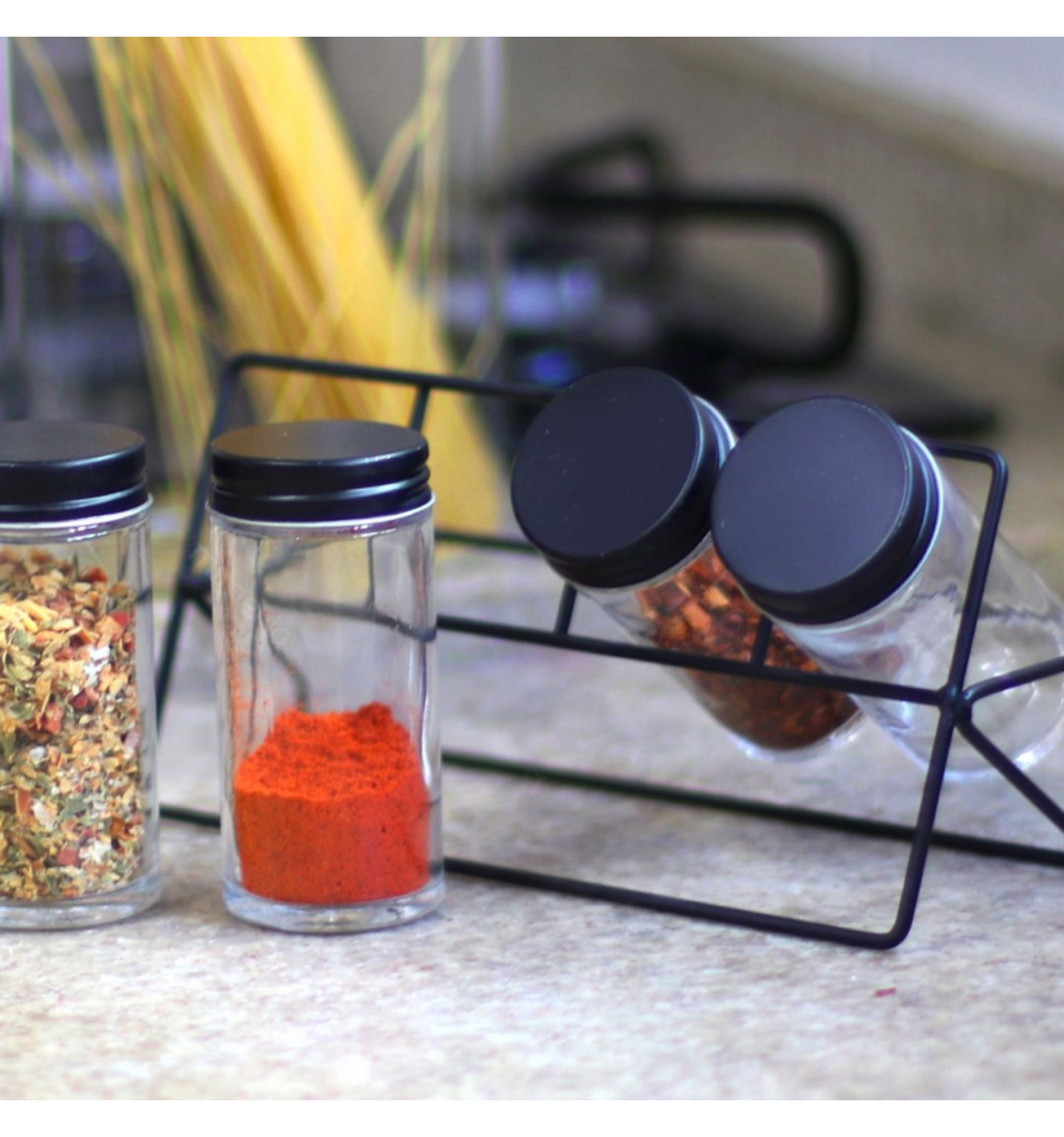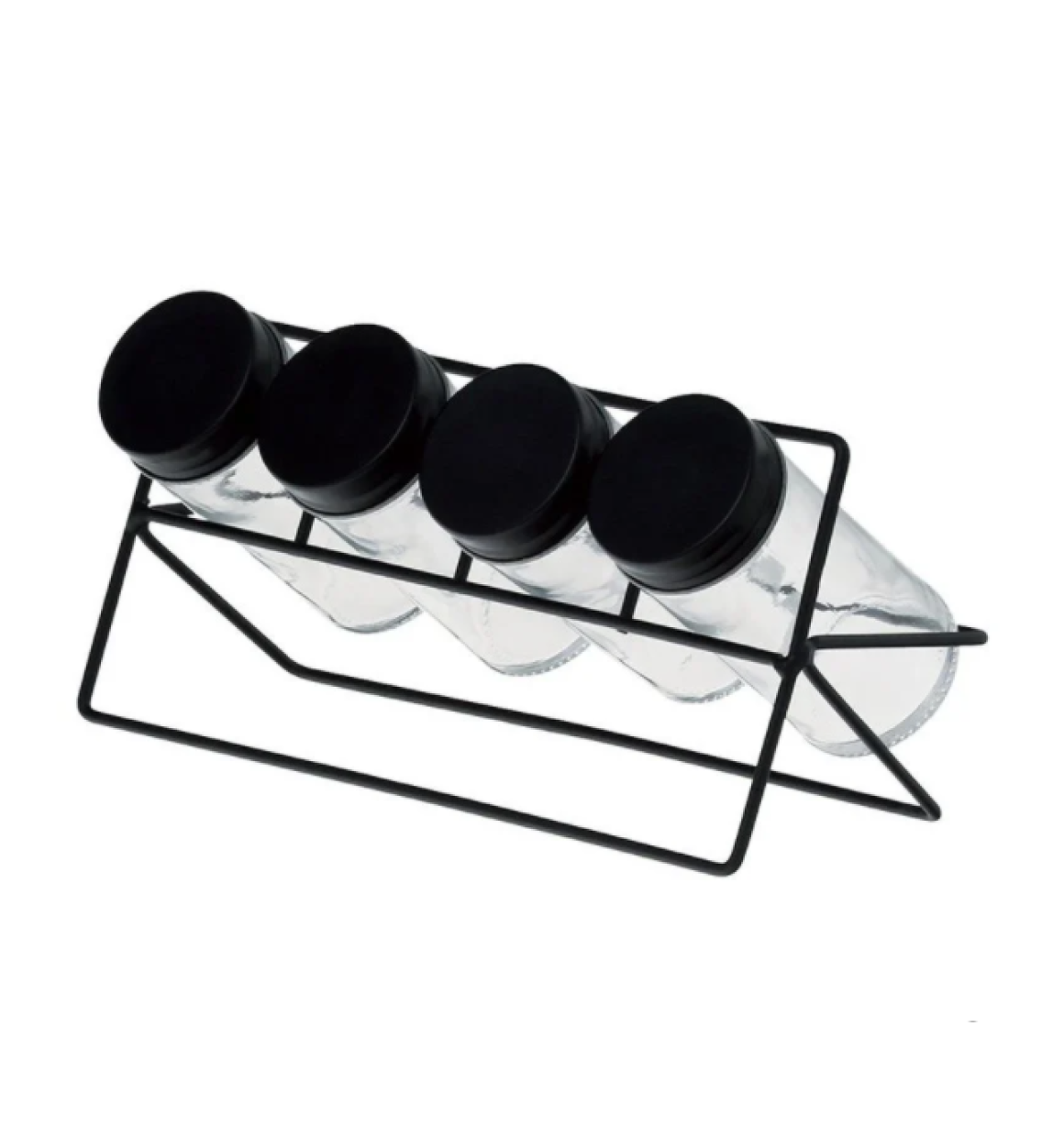 Porta Temperos com 4 Potes de Vidro e Suporte de Metal Preto