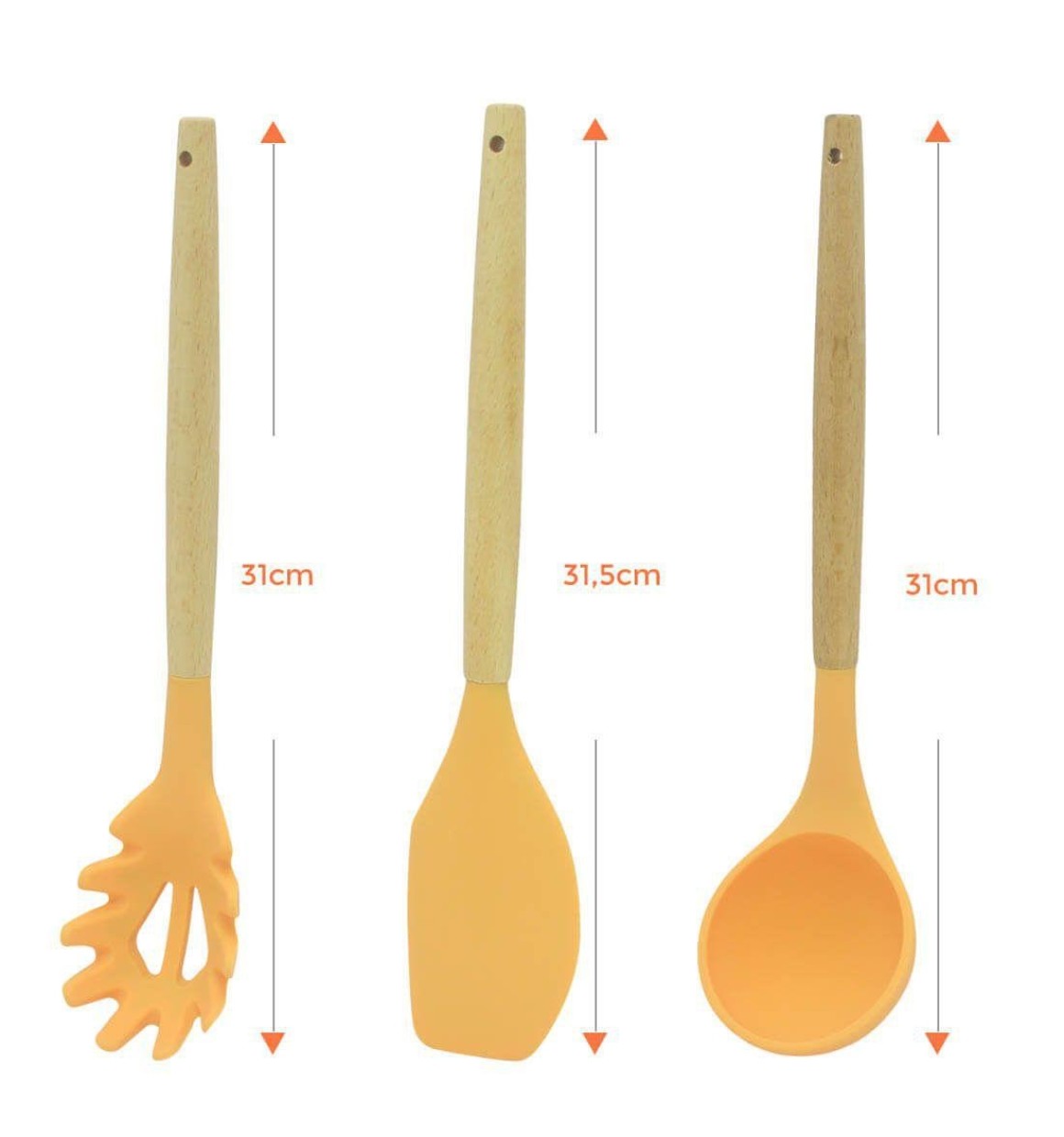 - Conjunto de utensílios revestido em silicone e cabo de madeira;