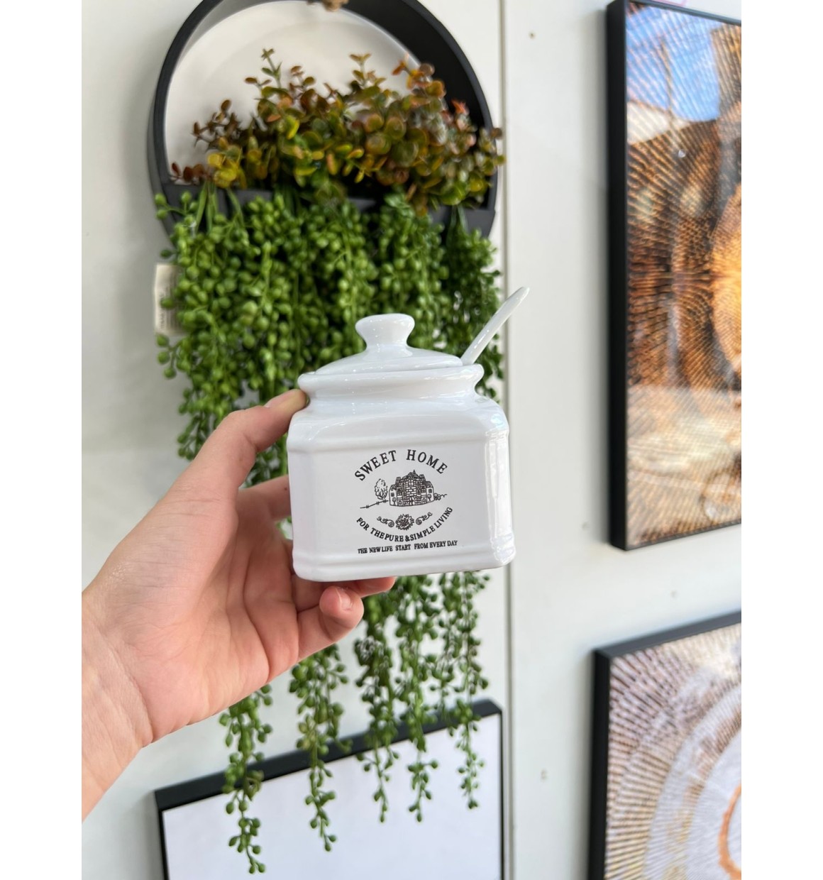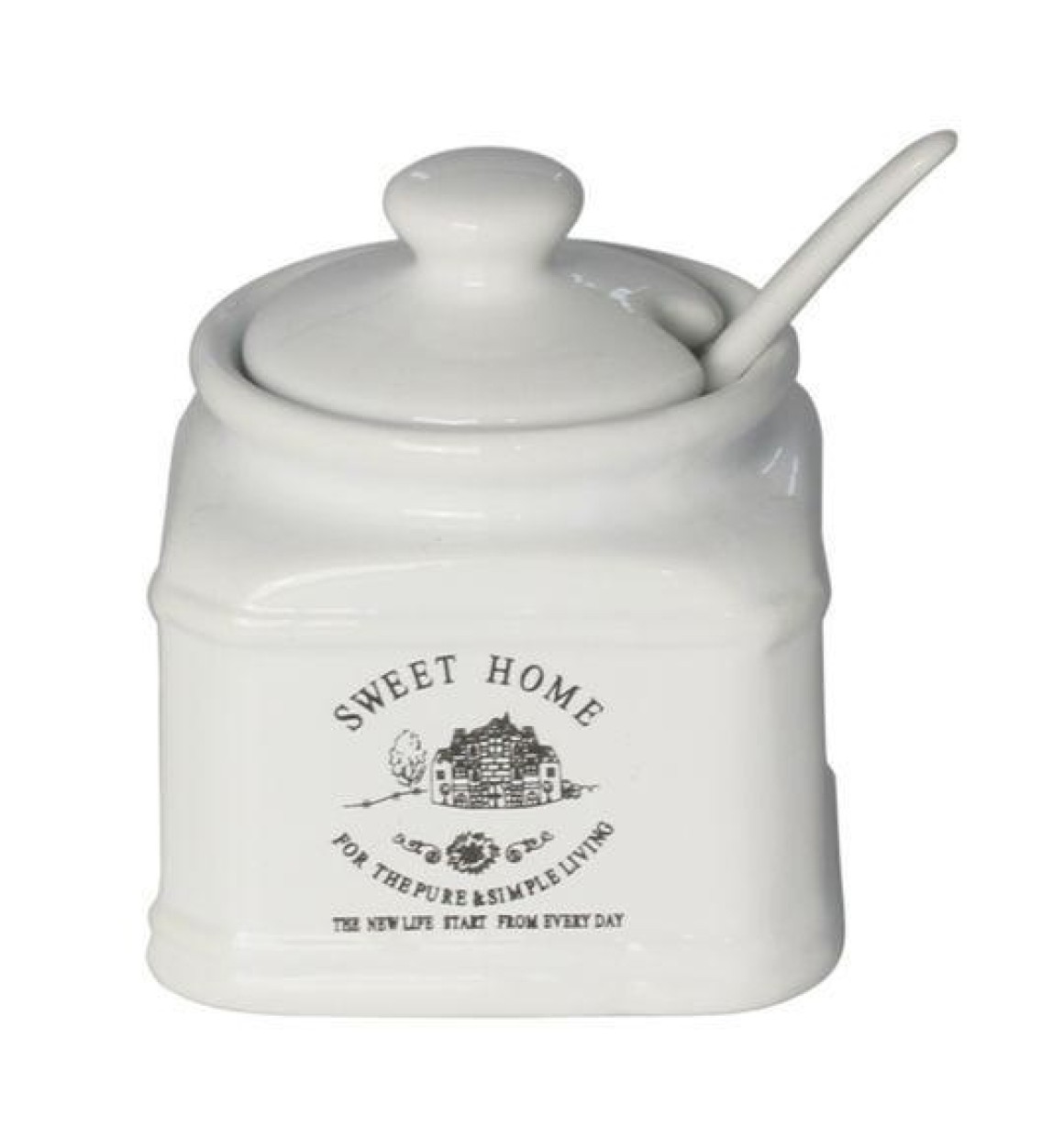 Esse açucareiro além de charmoso é muito funcional. Já vem com uma colher e tampa todo em porcelana;