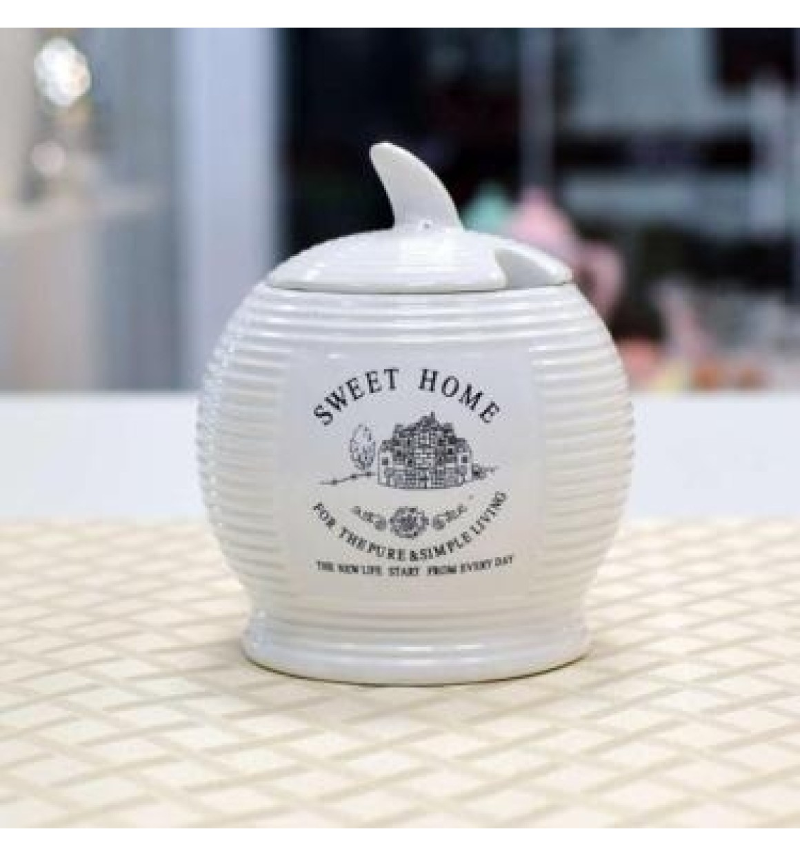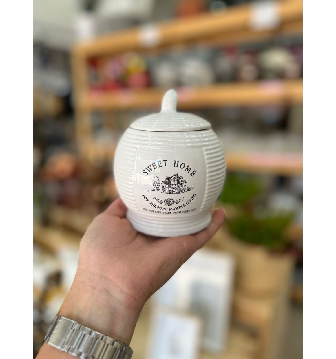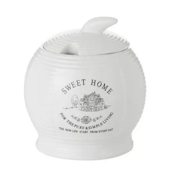 Açucareiro Sweet Home, em cerâmica, em formato redondo, com haste na tampa para puxar, ele é moderno e útil no dia a dia.