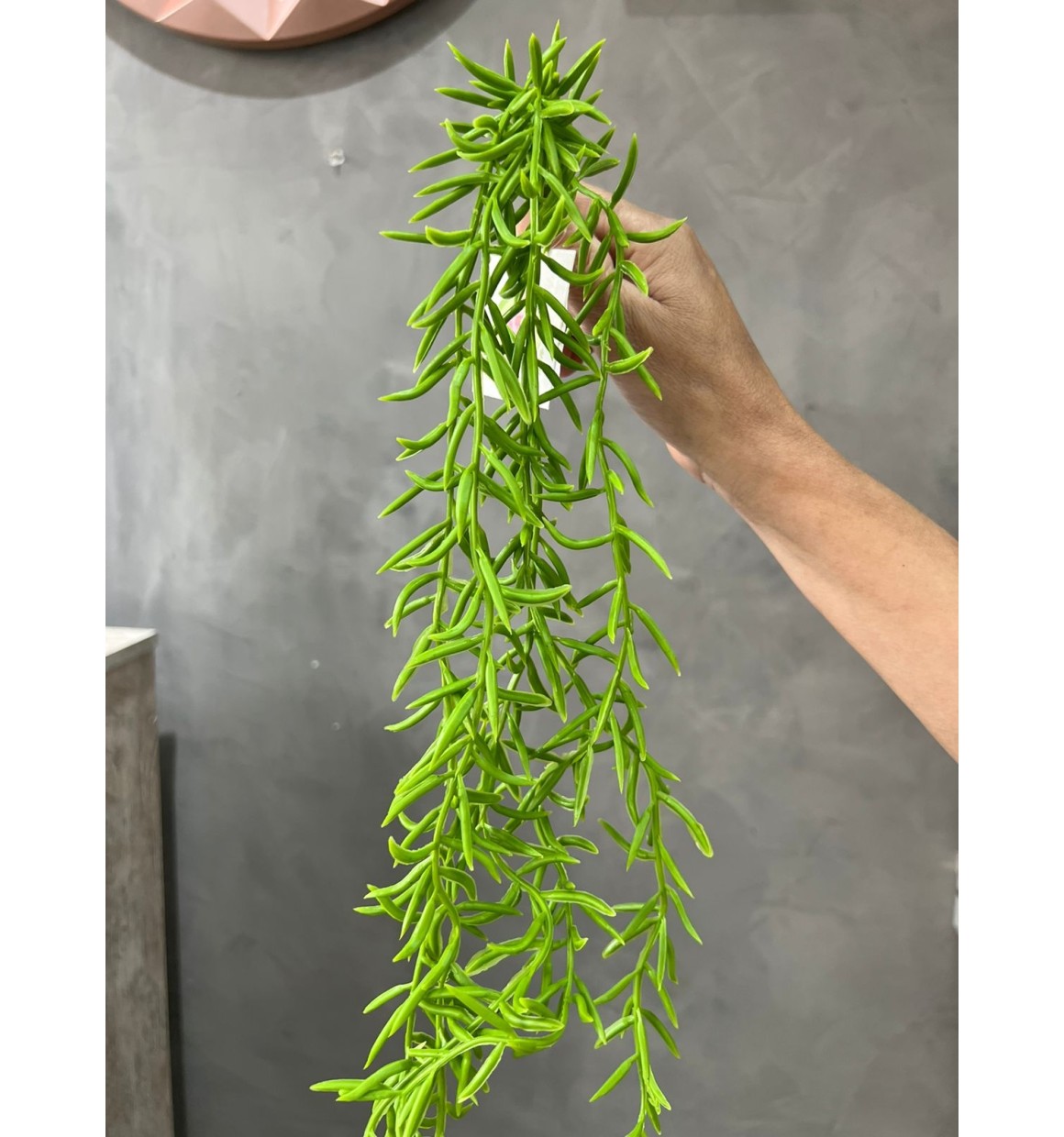 Folhagem Pendente Suculenta na cor verde. Planta muito detalhada, preenche vasos e cachepots proporcionando aspecto diferente para essas peças, mais elegância e charme, além de uma sensação de leveza e natureza.