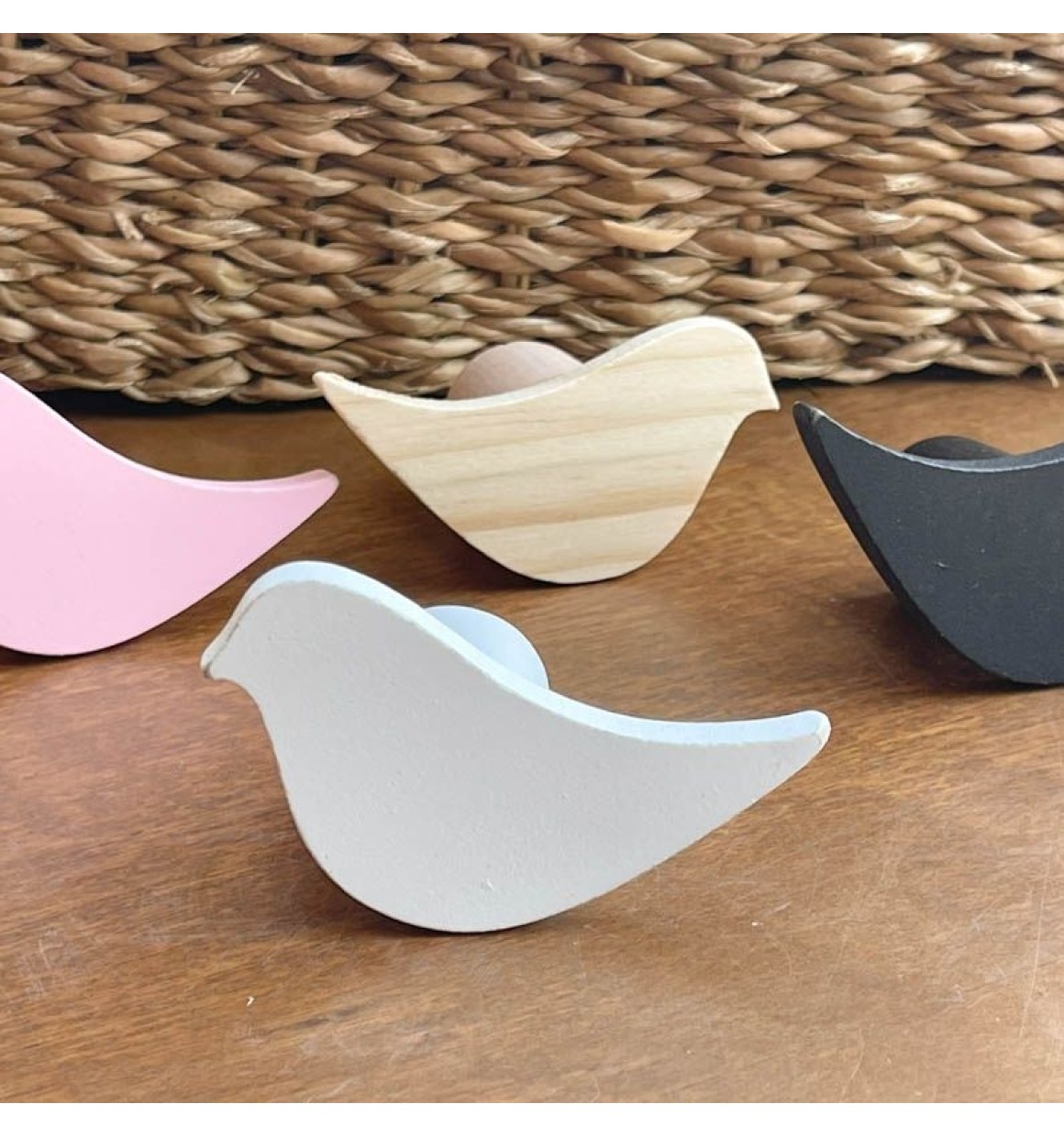 Um prático e lindo ganchinho de madeira com formato de passarinho - charme e praticidade para o seu dia-a-dia. Este gancho é perfeito para pendurar bolsas, mochilas ou peças de roupa. Muito prático para bolsas e similares, pois você poderá passar a alça por trás do gancho para manter o item pendurado com segurança. O gancho é composto de duas peças principais. A peça traseira, cilíndrica, comporta um parafuso com bucha (fornecido com o produto) que você irá utilizar para afixar na parede. A peça frontal, com formato de passarinho, cumpre a função decorativa e de gancho.
