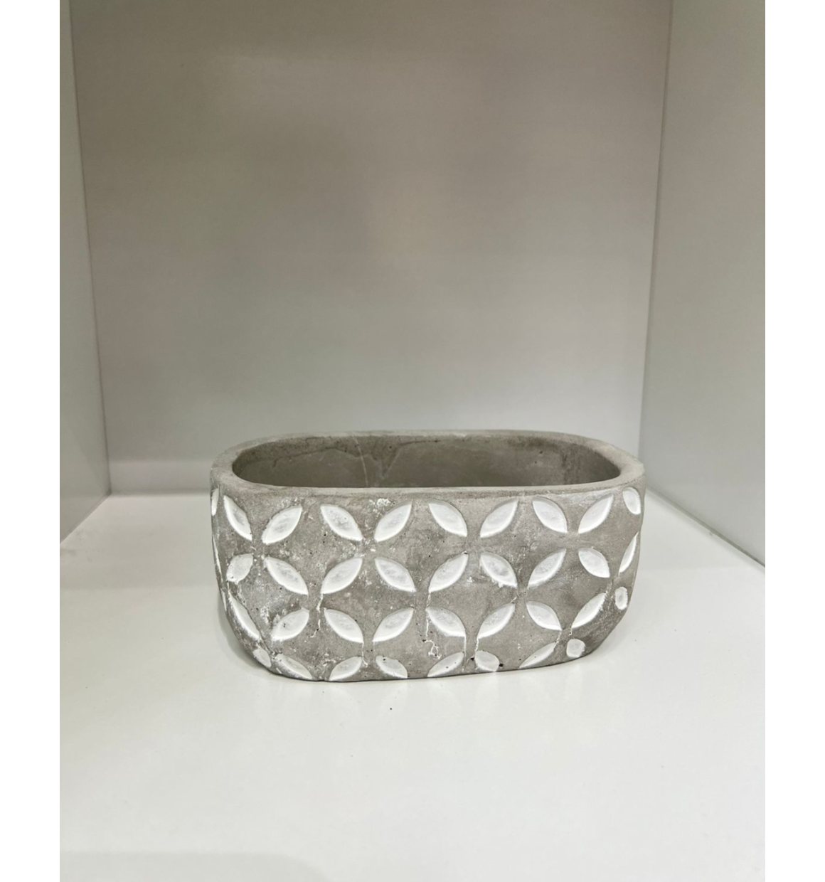 O Vaso de Cimento Decoração Oval Florzinha tem acabamento rústico, formato oval e parte externa decorada com flores brancas. Um charme!