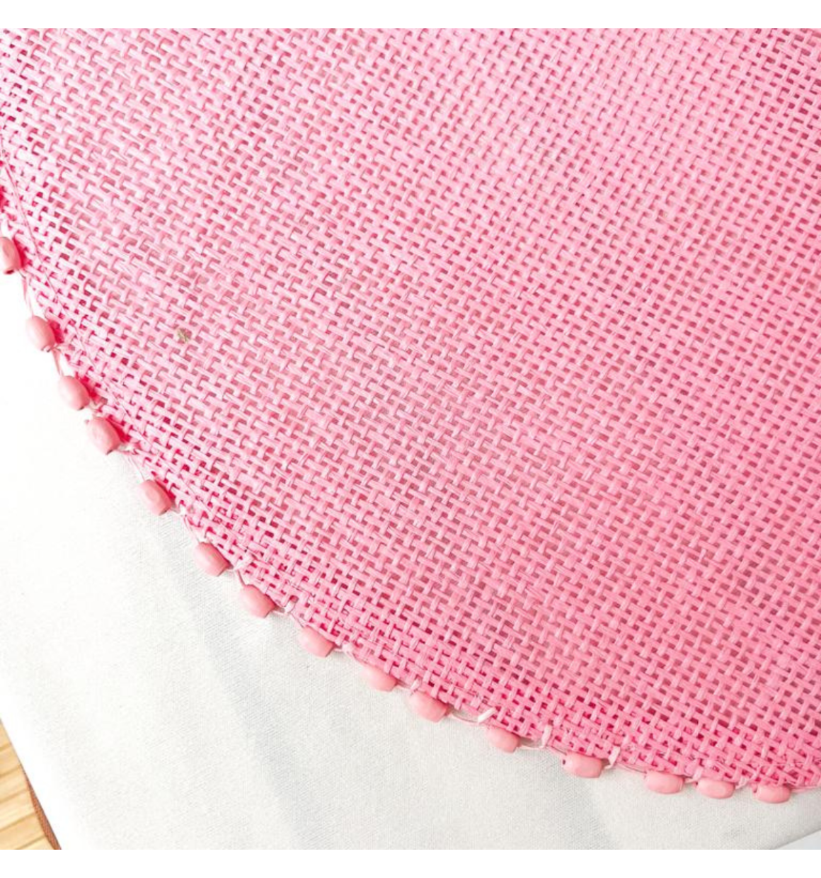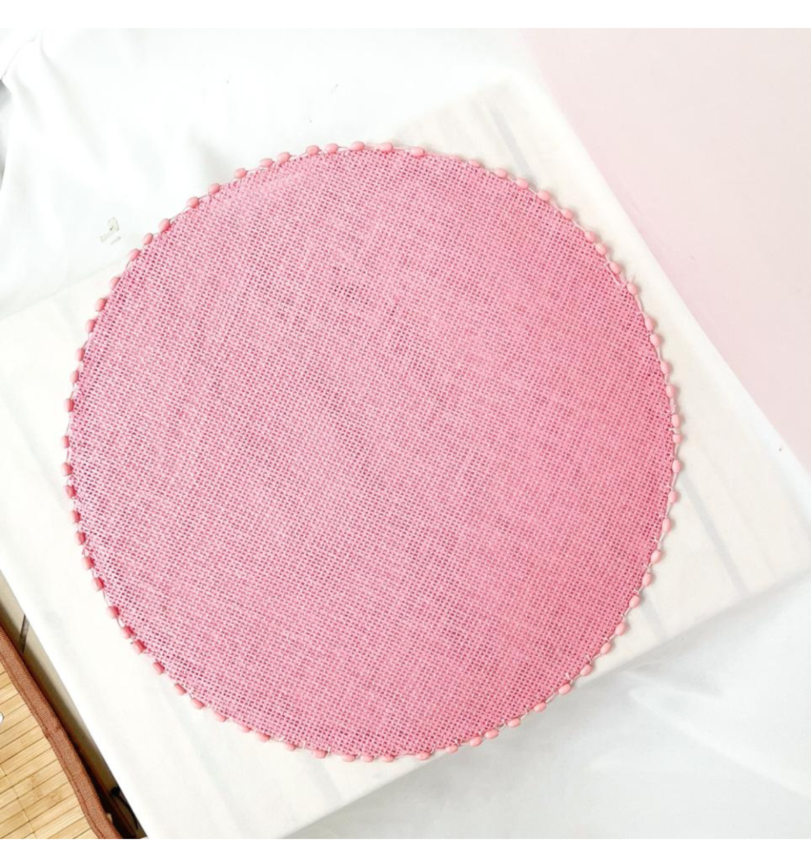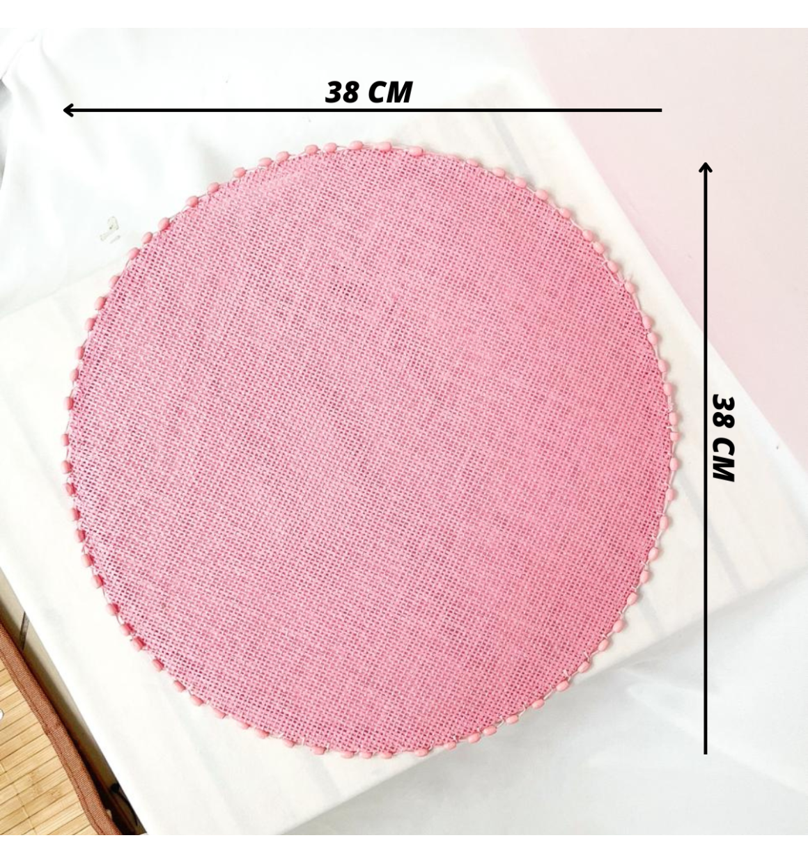 Jogo Americano Rosa Candy redondo trançado com bordas enfeitadas com bolinhas de madeira na cor Azul.