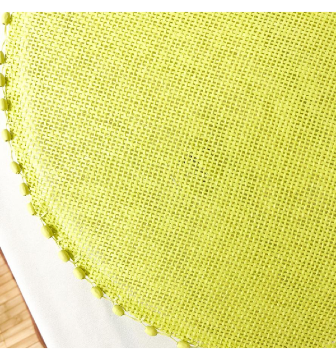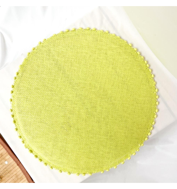 Jogo Americano Verde Limão Candy redondo trançado com bordas enfeitadas com bolinhas de madeira na cor Azul.