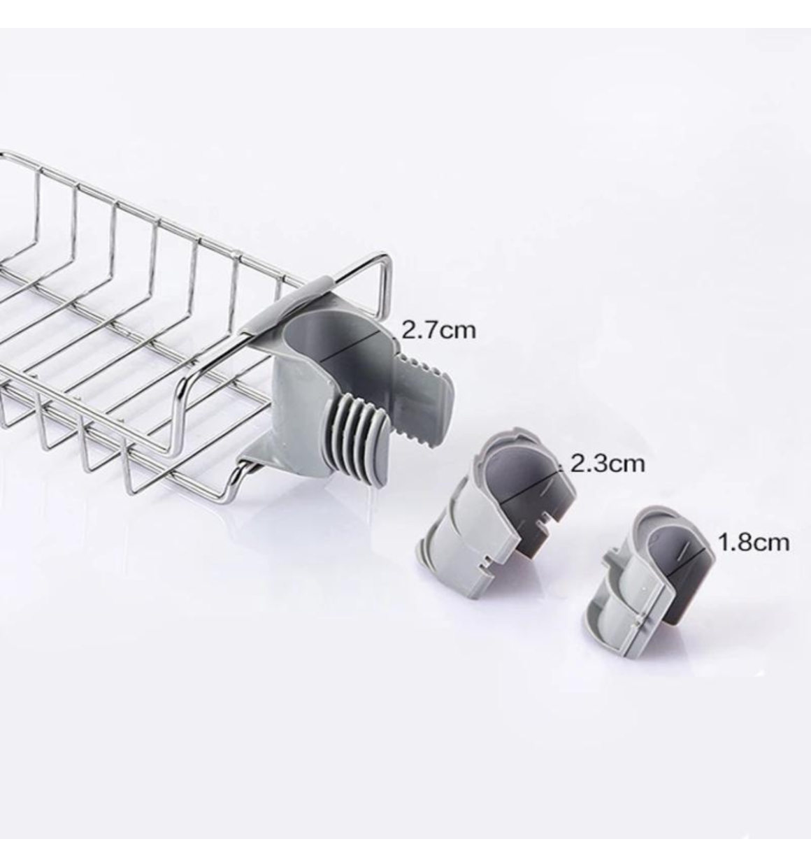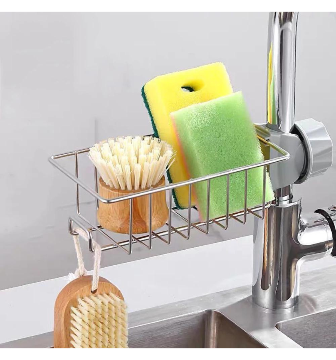 Com sua estrutura de aço inoxidável grande e plana, o Organizador Multiuso suporta perfeitamente varios acessórios de cozinha e banheiro, como buchas ou esponjas de limpeza.