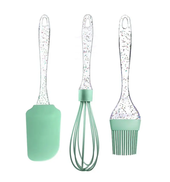 Kit de utensilio para cozinha acrílico com glitter e silicone 3 peças confeitaria,Lindo, prático, muito útil e versátil. O novo jogo de utensílios da COSY possui material resistente ao calor. É ideal para utilizar em panelas com revestimentos antiaderentes, pois não danifica o fundo. Um acessório com o charme e praticidade que sua cozinha precisa.