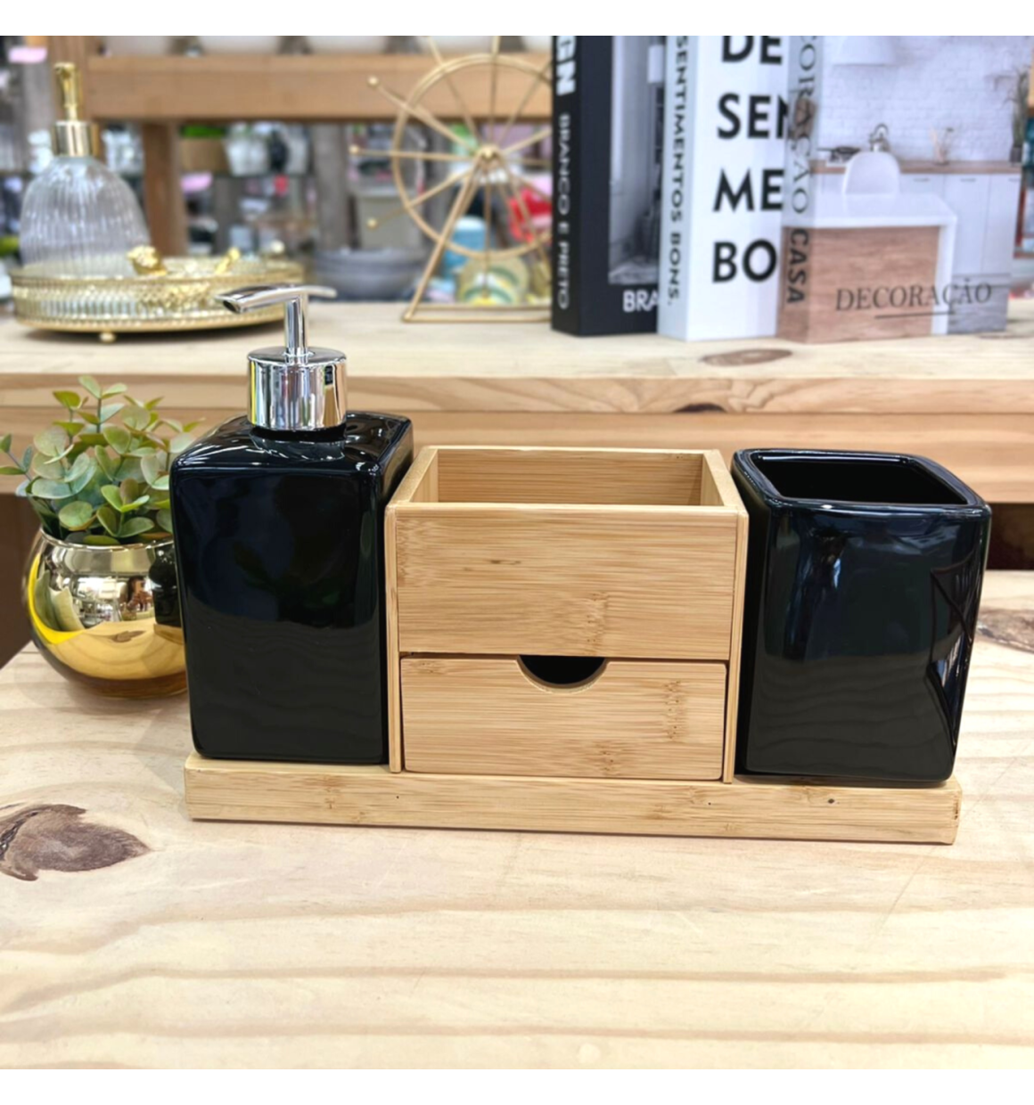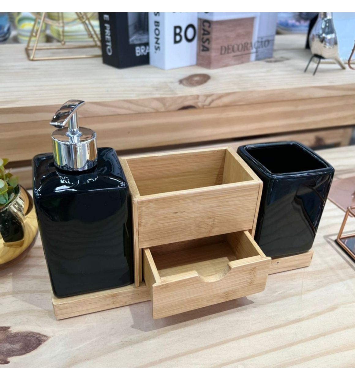 Elegante e prático, este jogo de banheiro dará um toque de modernidade ao seu banheiro. Composto por um porta sabonete liquido,um porta objetos de bambu com 2 gavetas e um copo. Compacto, este conjunto é ideal para pequenos espaços. Também pode ser desmontado e assim usar a base como uma pequena bandeja para bijuterias ou outros pequenos objetos do dia a dia.
