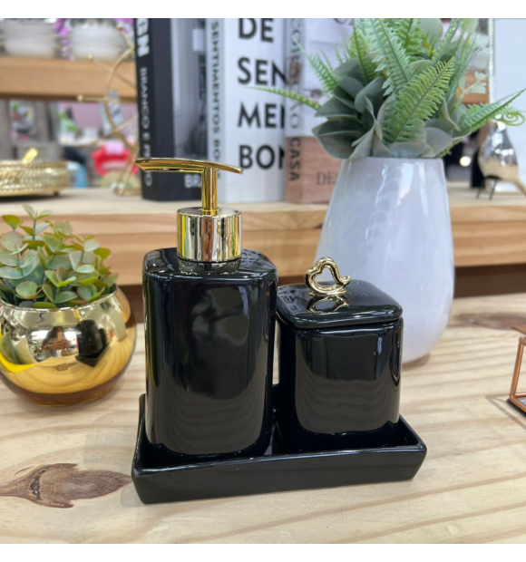 Jogo de Banheiro Marmore Preto 3 Peças de Porcelana - Coração Dourado