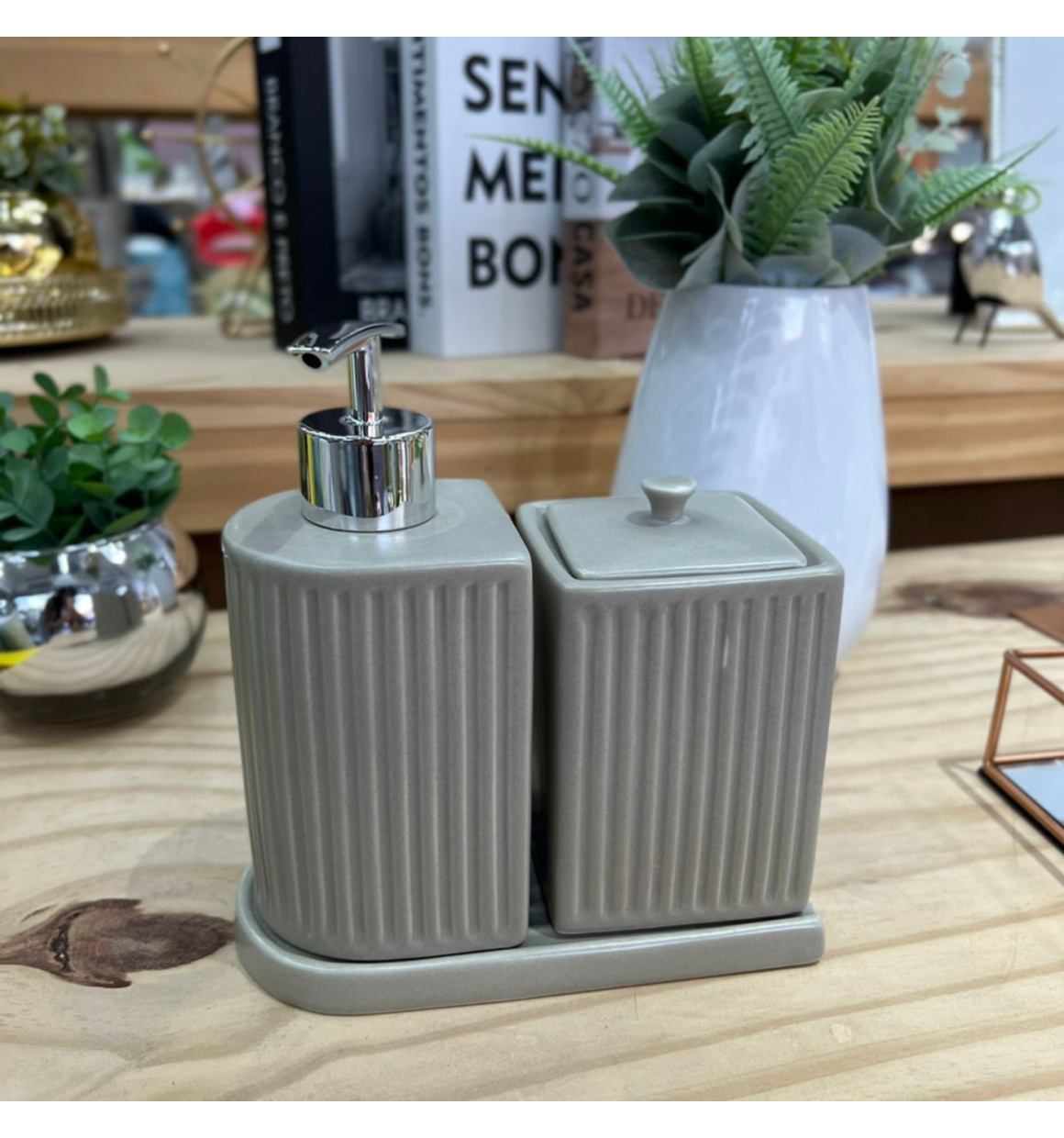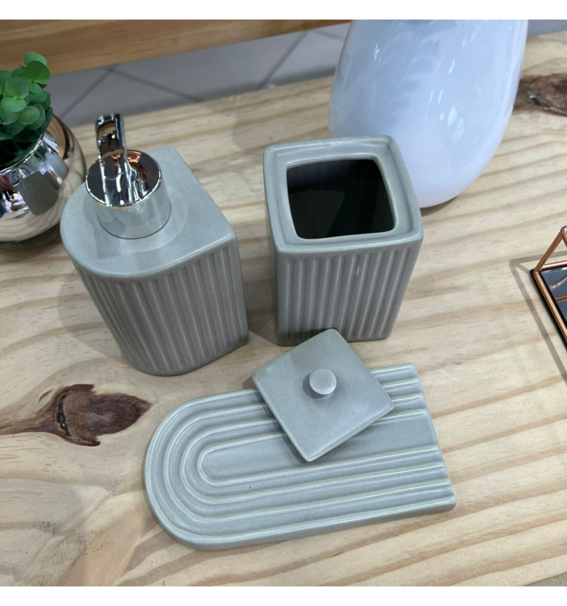 Jogo Banheiro Nude com Listras 3 Peças de Porcelana.