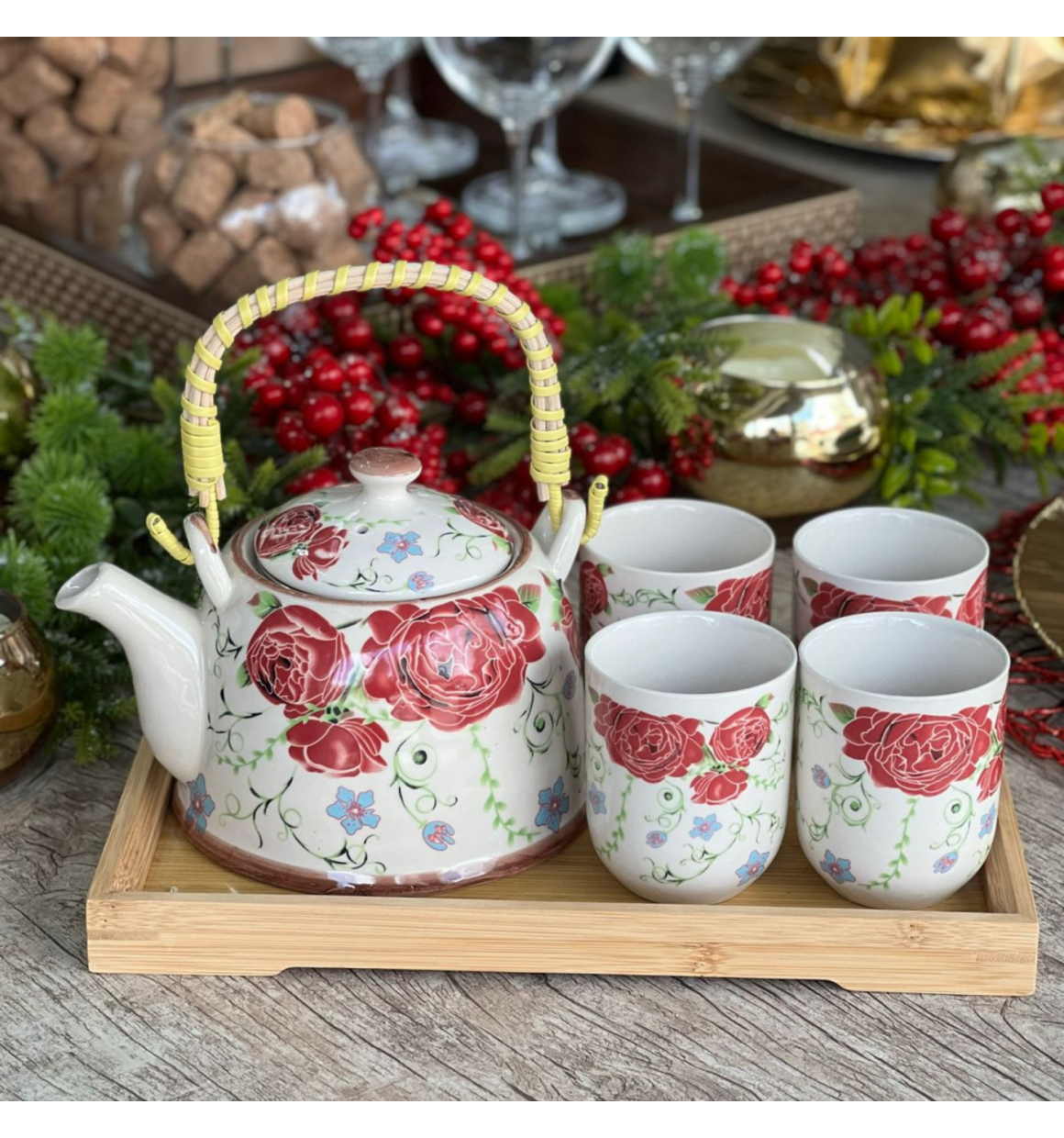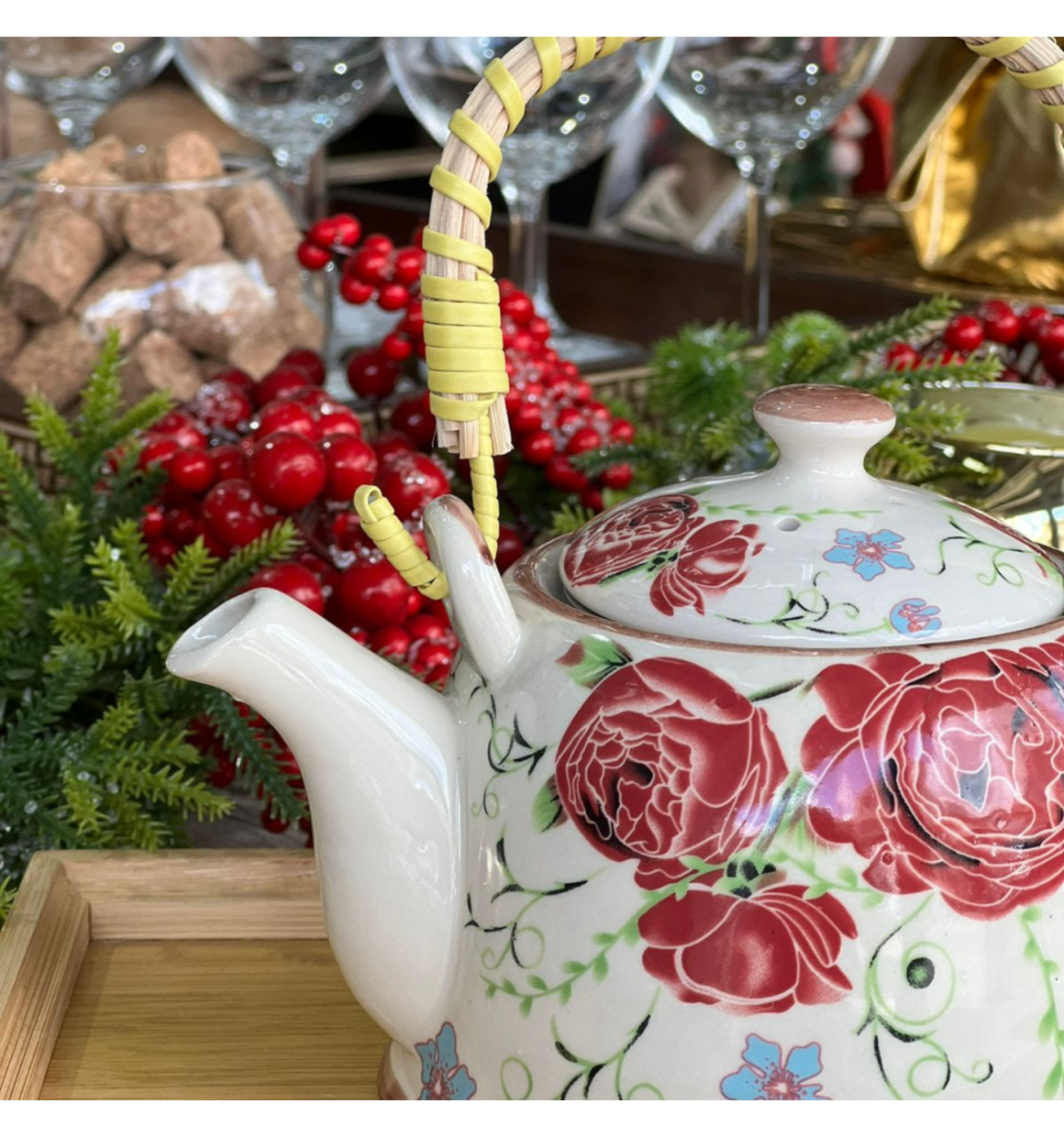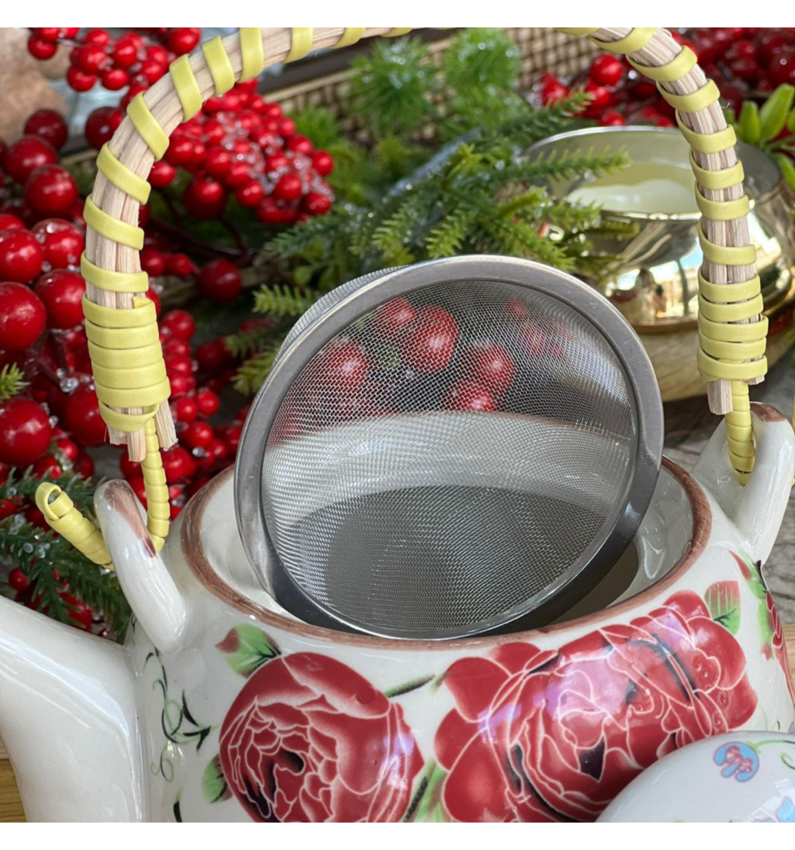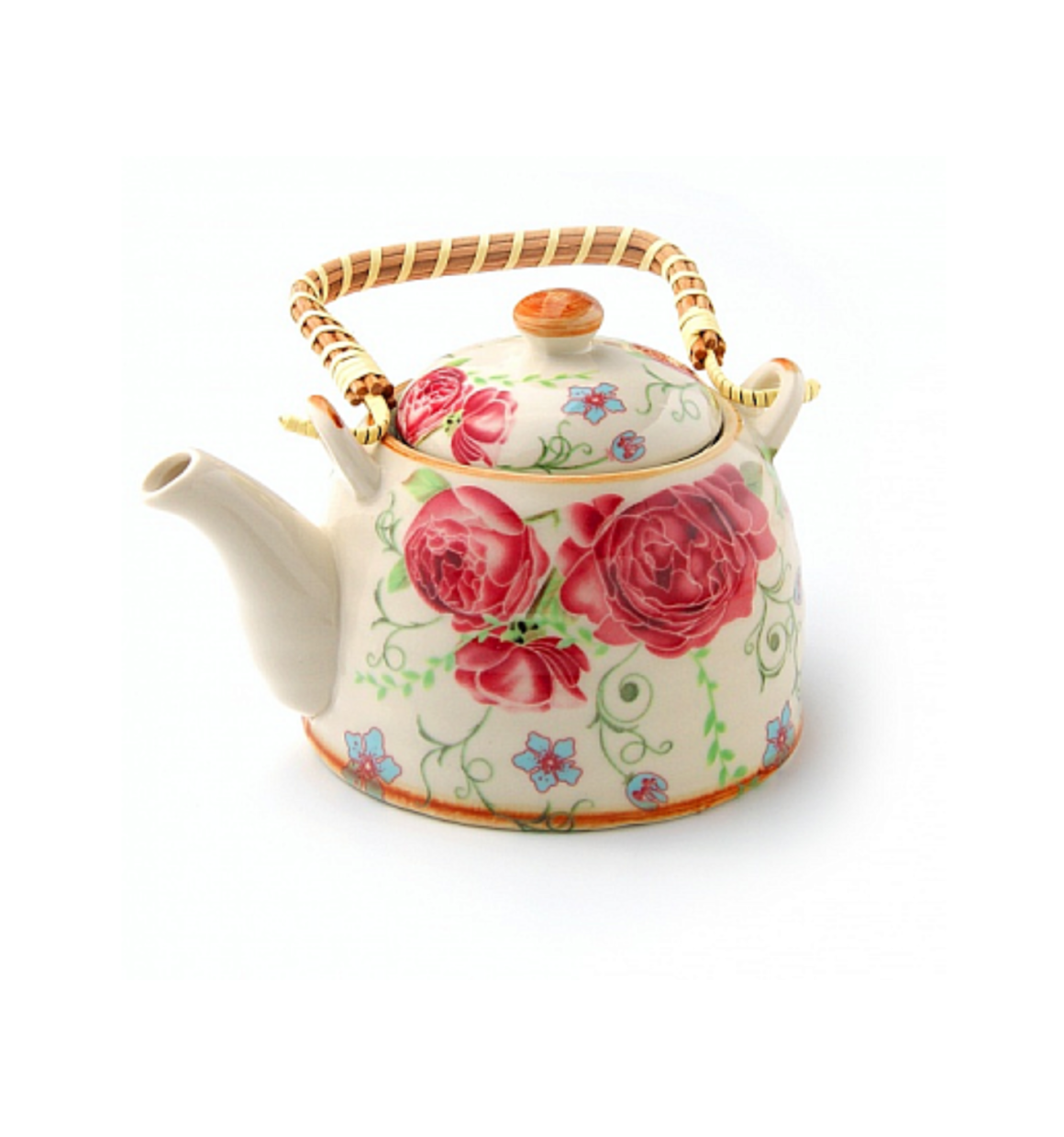 Bule de porcelana decorativa estilo oriental com decoração floral e alça de bambu trançado. acompanha tampa e infusor que se encaixa na borda, facilitando o preparo do chá. alça e coador removivel para lavagem.