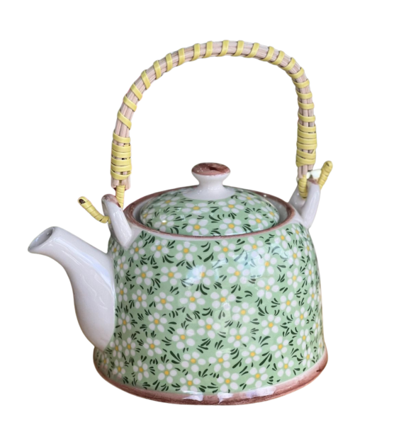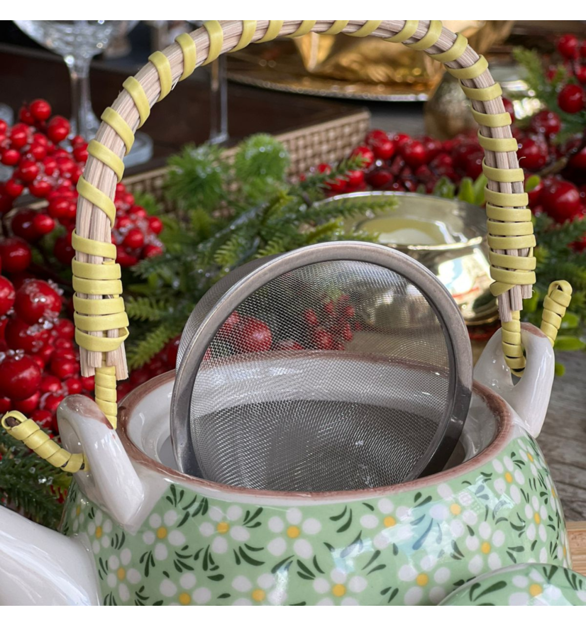 Bule de porcelana decorativa estilo oriental com decoração floral e alça de bambu trançado. acompanha tampa e infusor que se encaixa na borda, facilitando o preparo do chá. alça e coador removivel para lavagem.