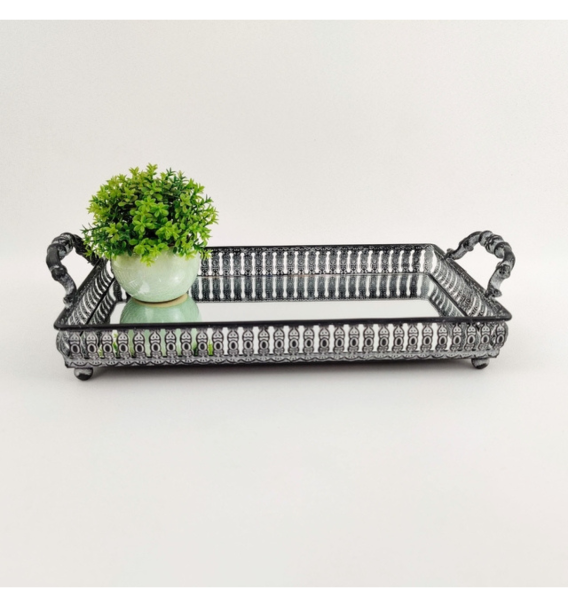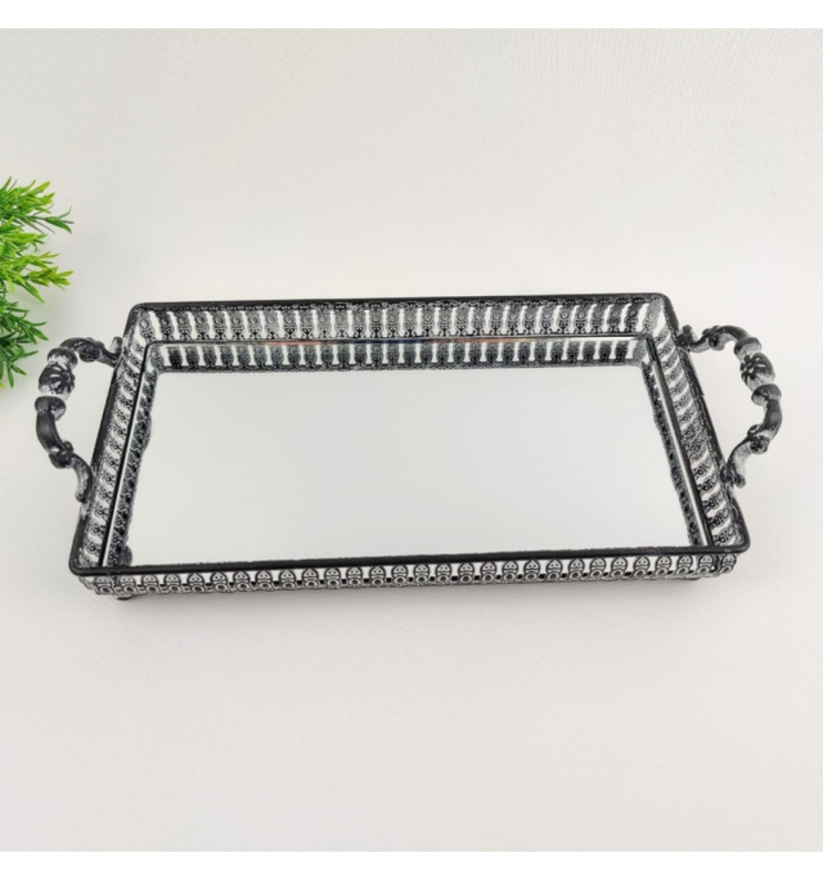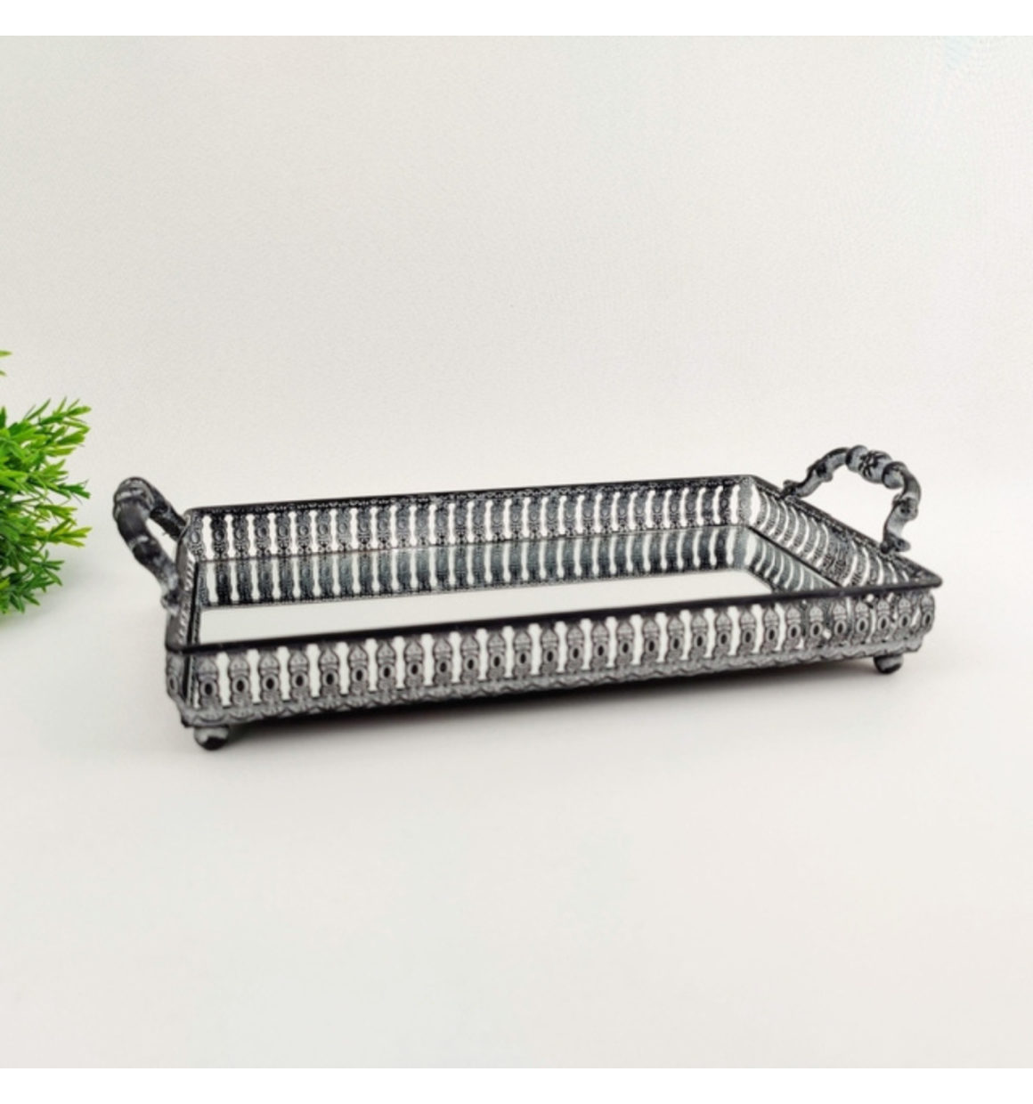 Bandeja Prata Retangular Dahab em Ferro com Espelho e Alça