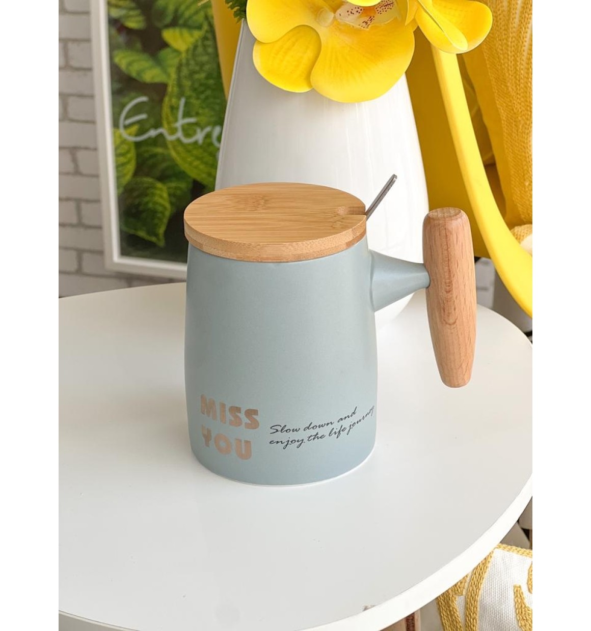 Caneca Azul de Cerâmica com Tampa de Bambu 350ml
