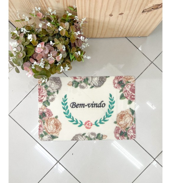 Tapete "Bem Vindo" Floral de Plástico - Bege Mod.3