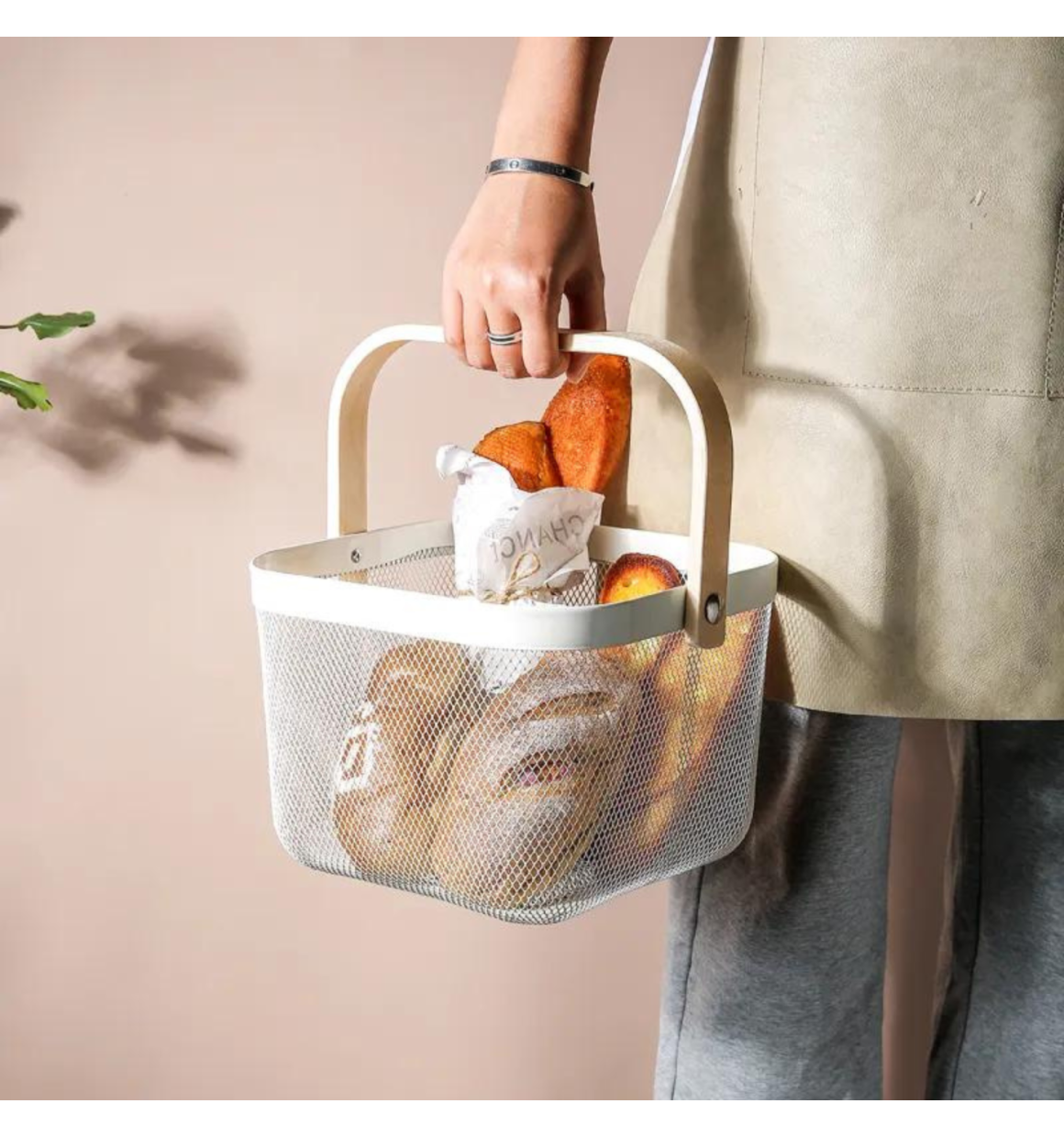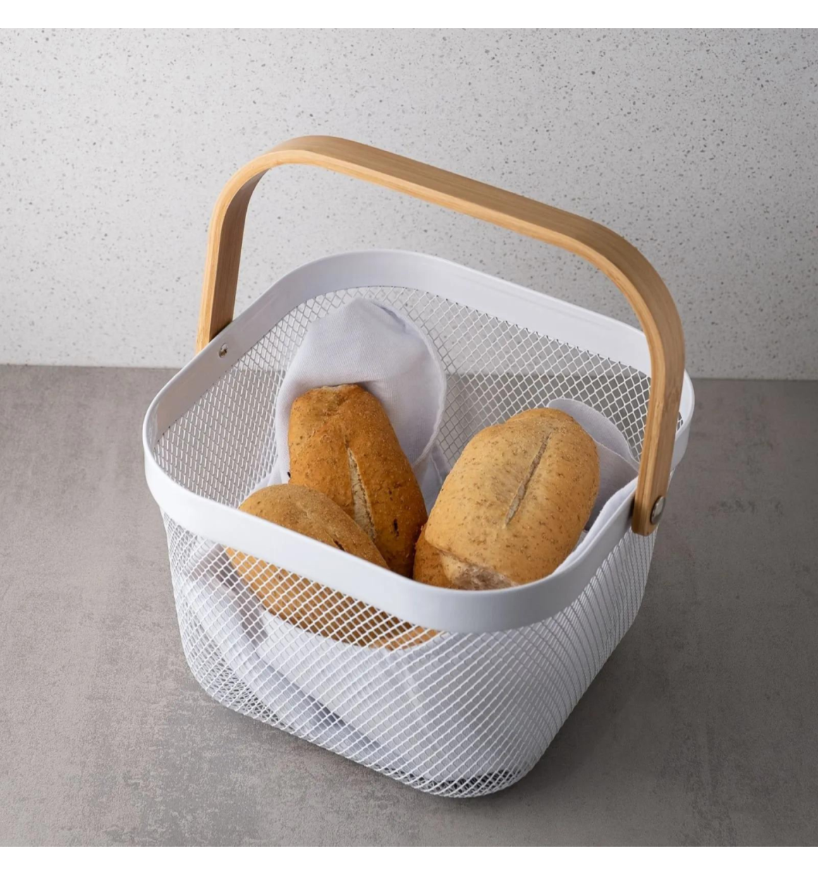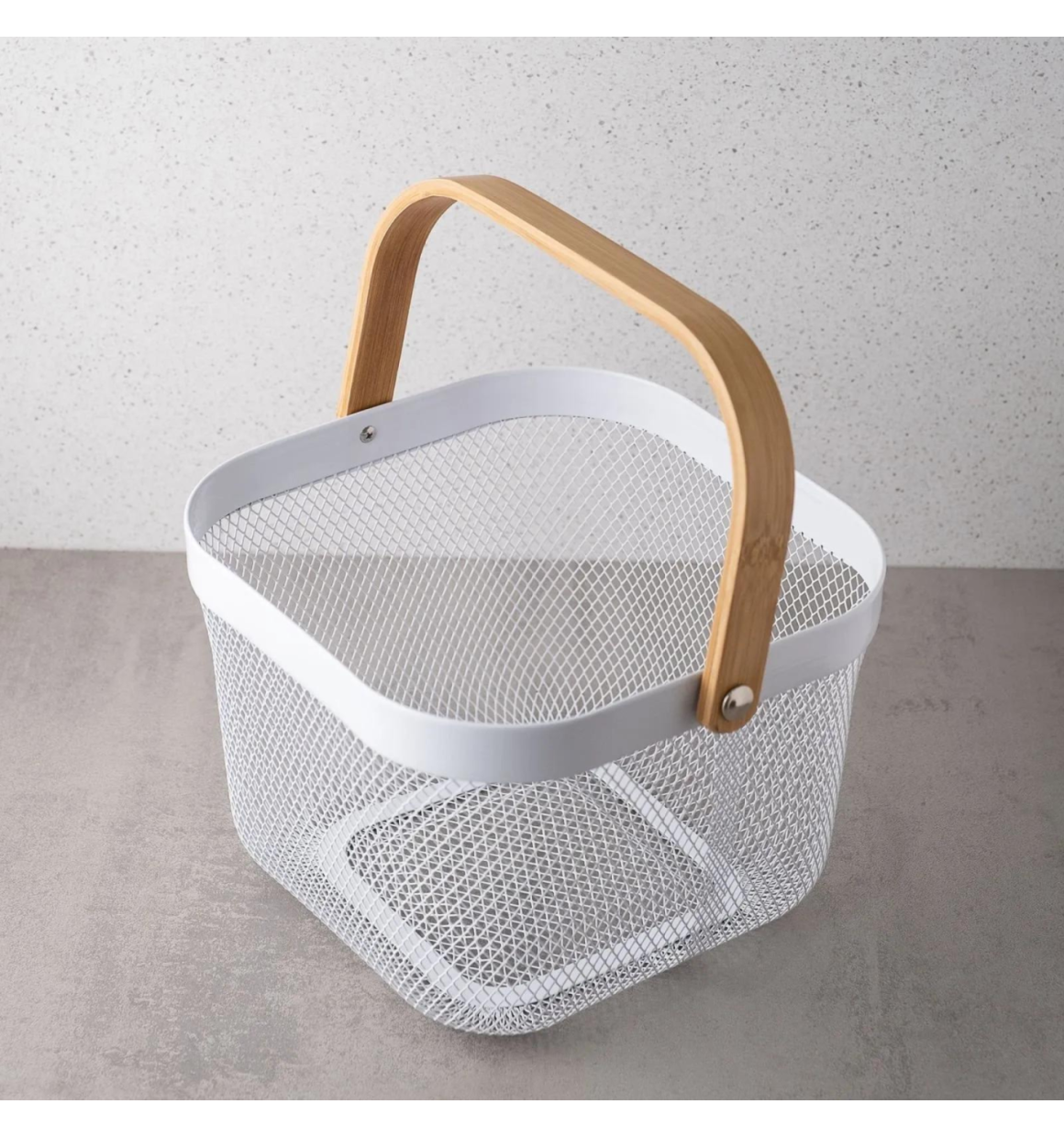 Cesta /Fruteira Branca de Metal com Alça de Madeira - "Quadrada" é perfeita para adicionar um toque de estilo e praticidade à sua cozinha, sala ou área de serviço. Sua estrutura metálica é robusta e confiável, enquanto a alça de madeira proporciona um contraste elegante.