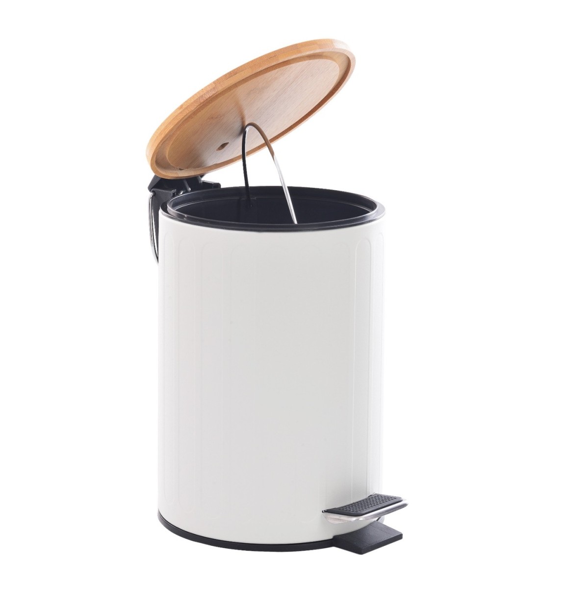 Lixeira 3L Branca com Tampa de Bambu com Pedal Canelada
