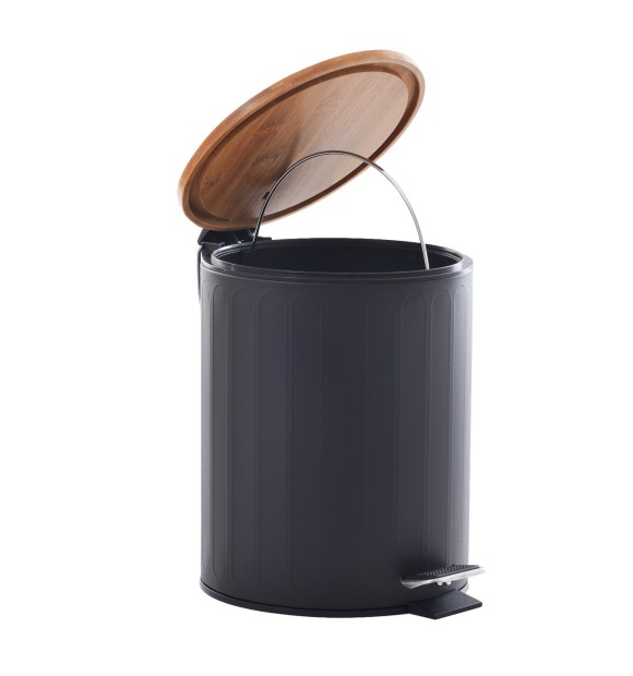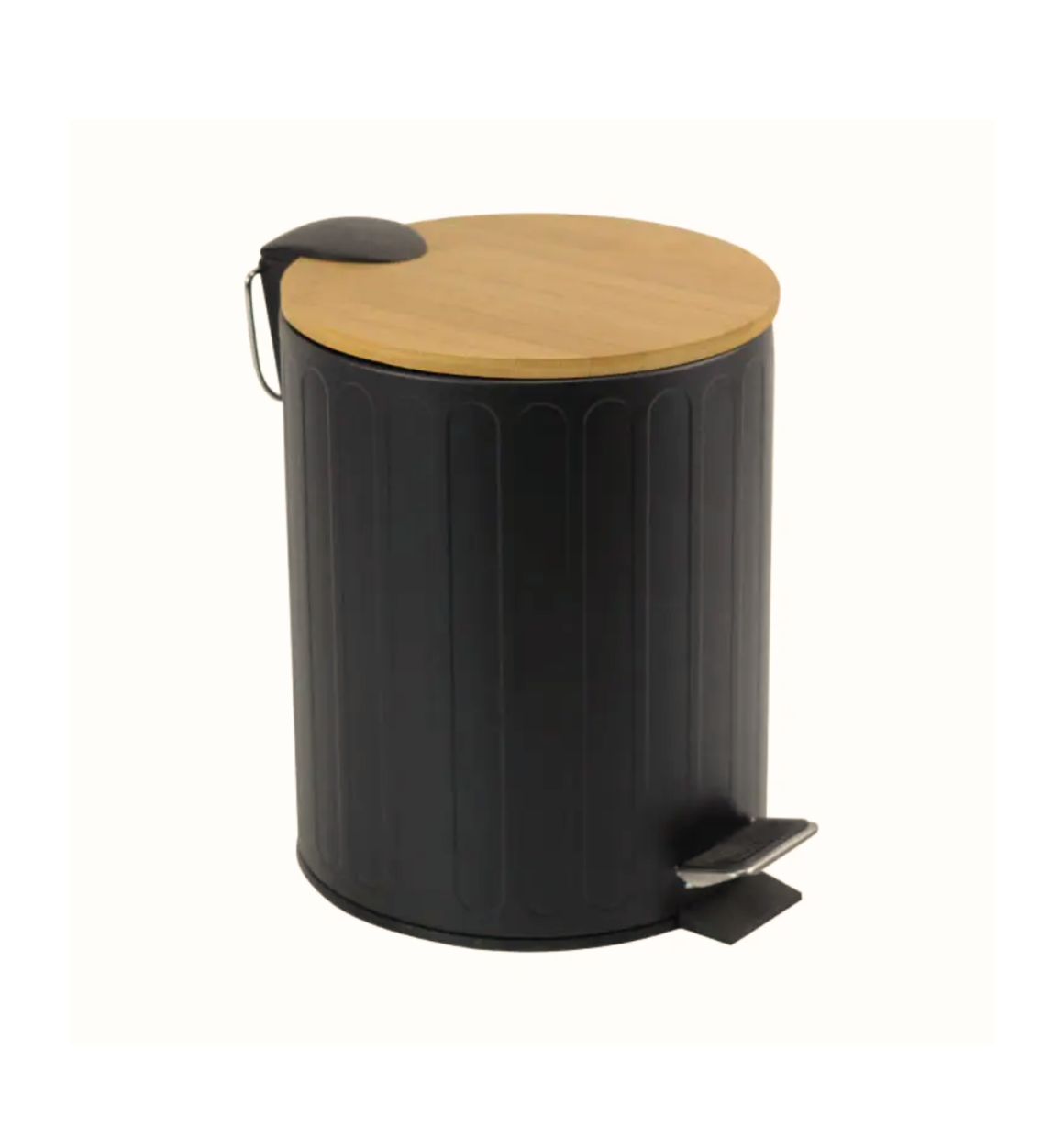 Lixeira 5L Preta com Tampa de Bambu com Pedal Canelada