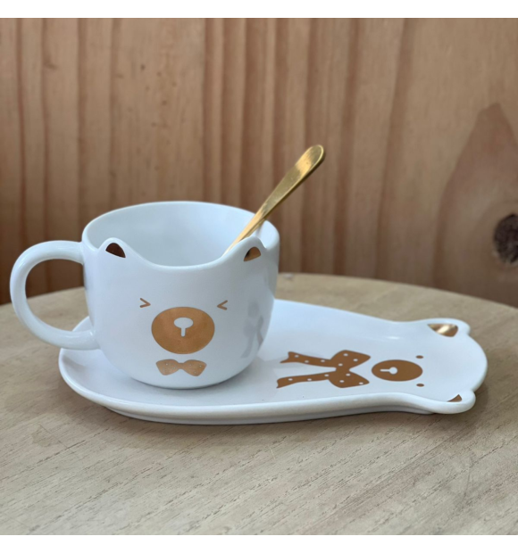Xicara de Cerâmica Branca ''Ursinho'' com Pires + Colher - 220ml