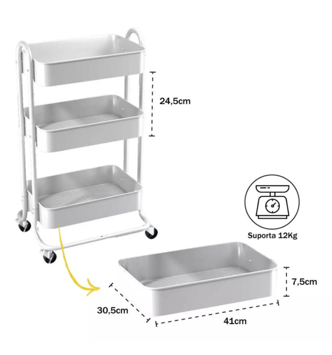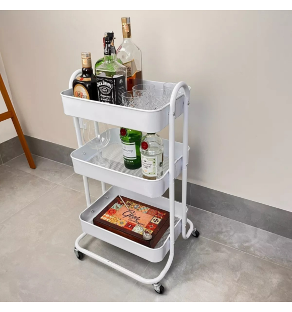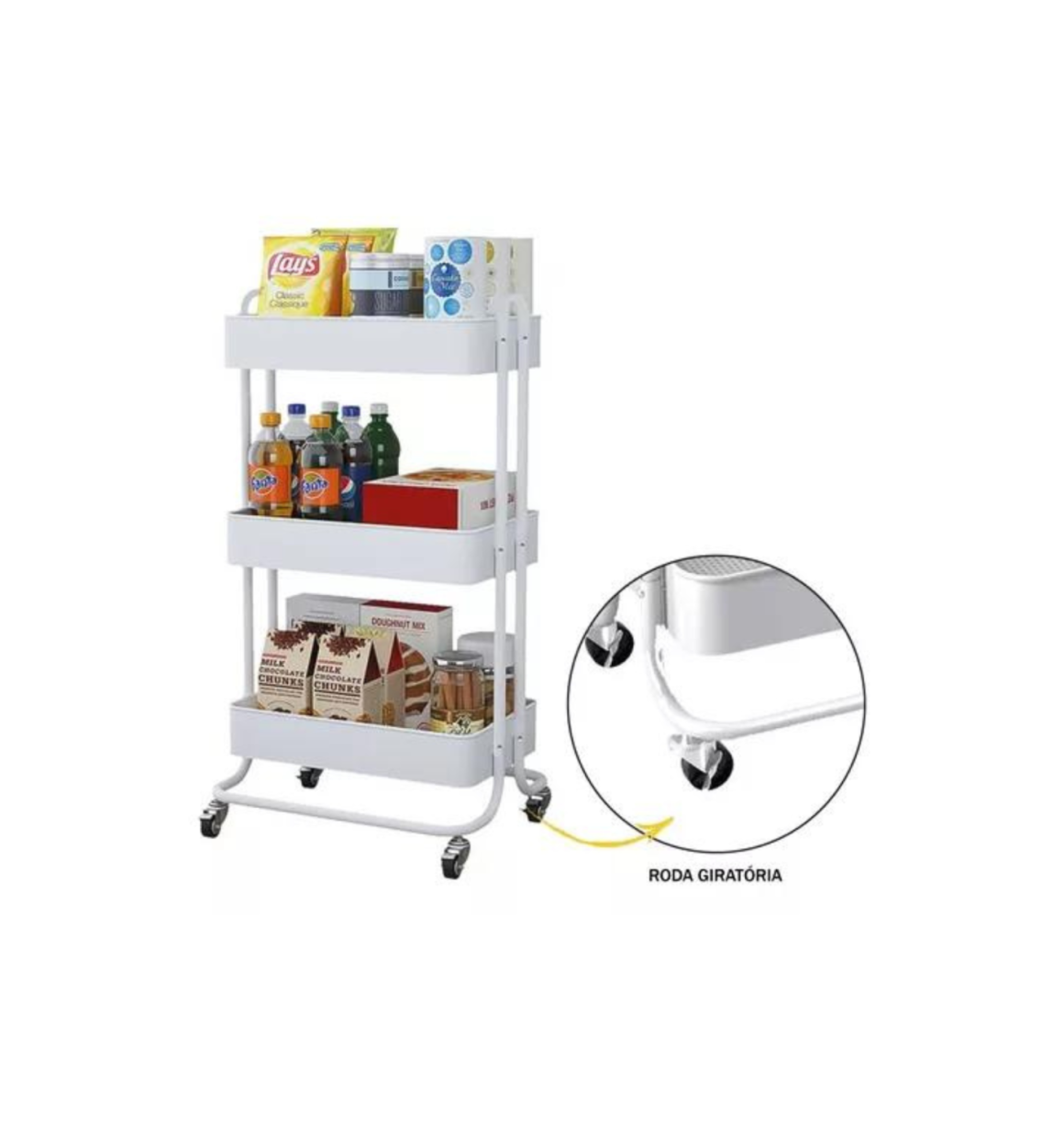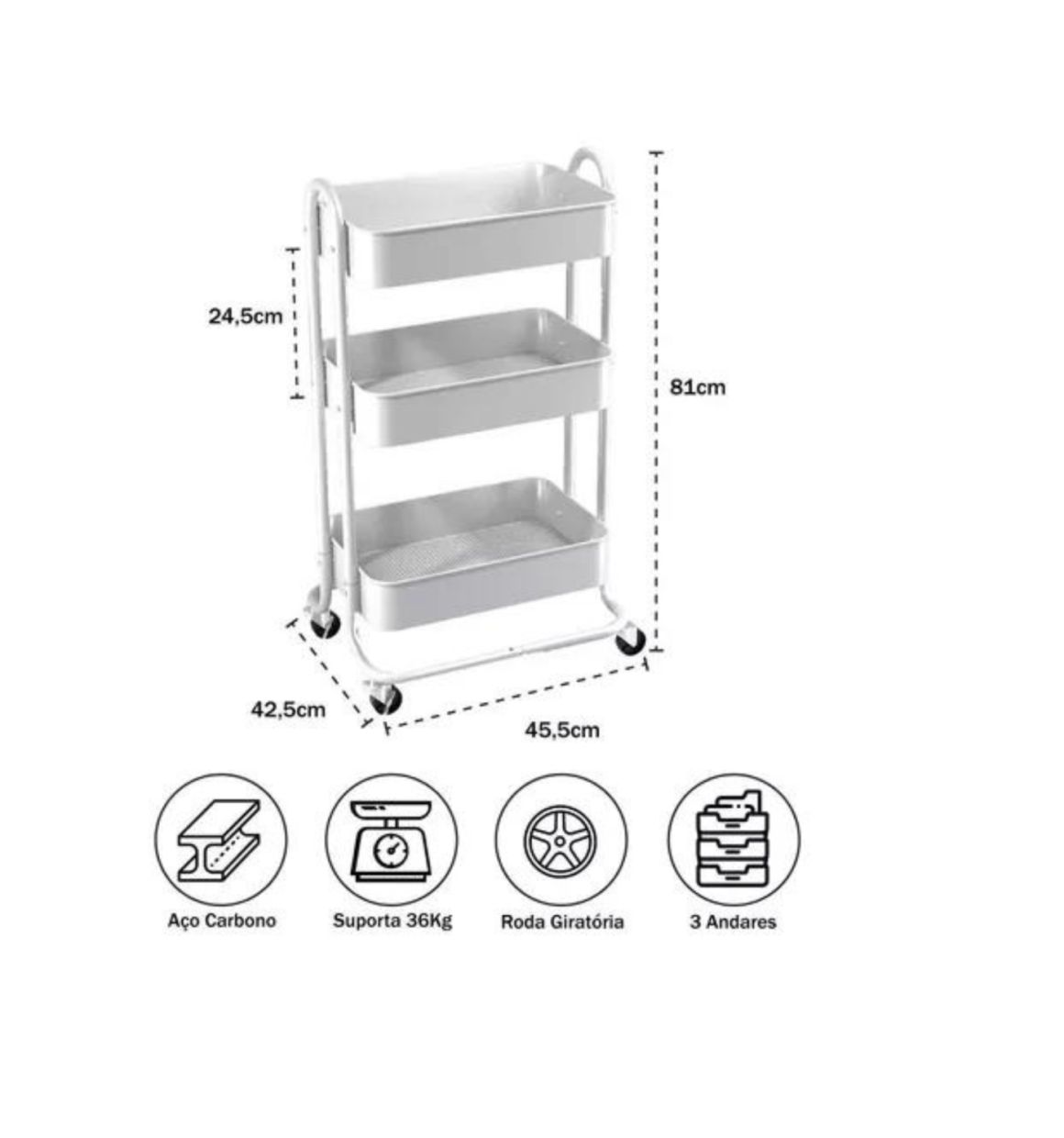 Construído em aço carbono resistente, o carrinho é durável e pode suportar uma variedade de objetos. As rodinhas articuladas facilitam o deslocamento do carrinho, tornando-o ideal para diversas situações, seja para organizar utensílios de cozinha, produtos de beleza, materiais de escritório ou qualquer outro item que você precise.