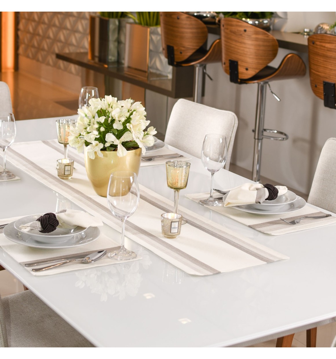A Linha de Trilho de Mesa Fio Tinto possui um desing elegante e charmoso com cores neutras e delicadas que dão um toque especial na mesa. Ele é versátil e combina com diversos tipos de ocasiões e compondo diferentes tipos de mesa. Devolvido em tecido 100% algodão, fio tinto e acabamento premium esse lindo jogo americano alia perfeitamente qualidade e beleza.