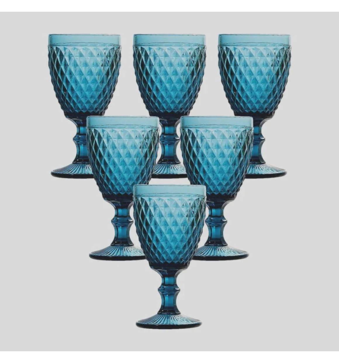 O Jogo de 6 taças de água Azul modelo Bico de Abacaxi feita em vidro de ótima resistência. Item versátil, de fácil limpeza e armazenamento. Taça transparente o Bico de Abacaxi 325ml apresenta design vistoso e moderno, tendo o corpo todo decorado com losangos em relevo, charmosos e brilhantes como pequenos triângulos. Na composição de sua mesa posta, as taças de vinho, agua ou suco ocupam um lugar de destaque na decoração, já que são belíssimas e fáceis de combinar com outros utensílios para servir.