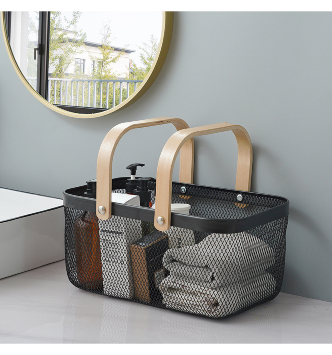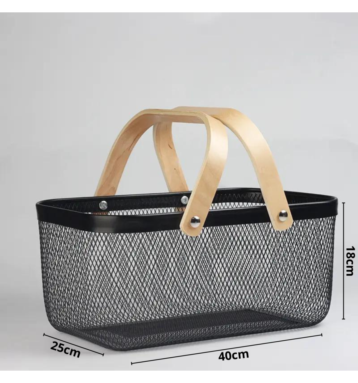 Cesta /Fruteira de Metal Preta com Alça de Madeira - (G)