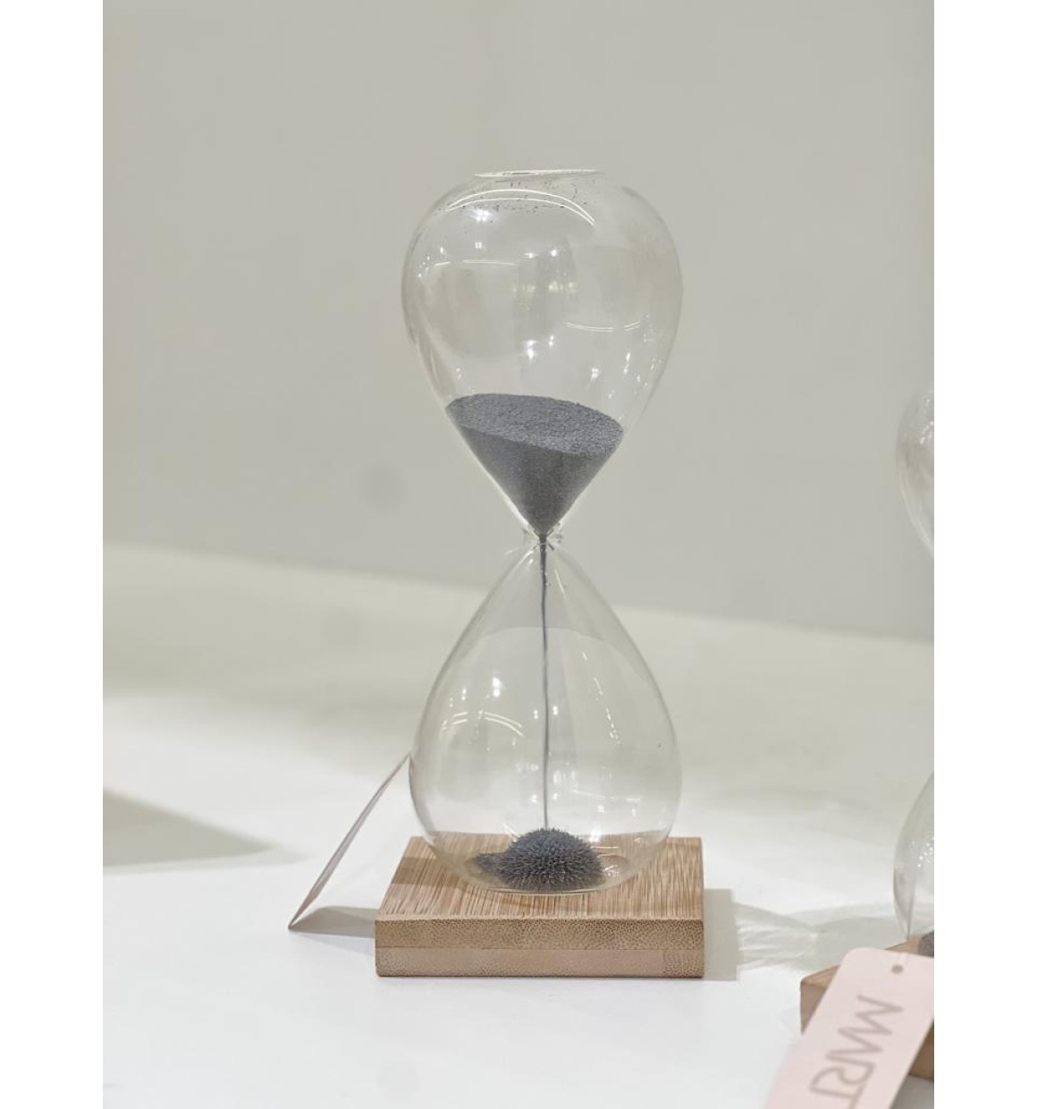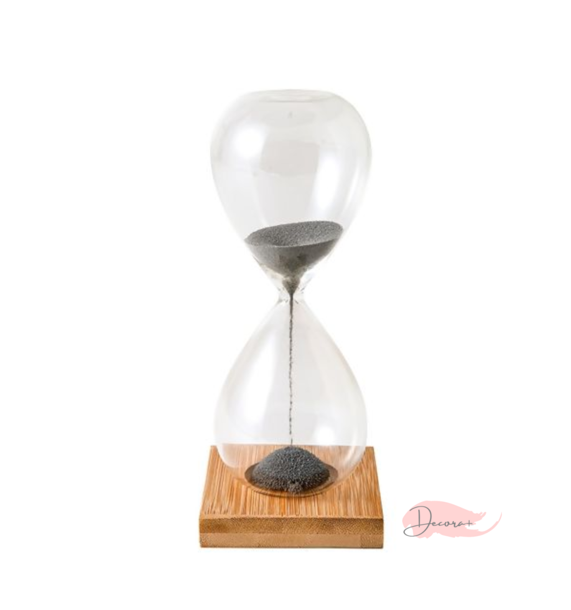 Ampulheta Decorativa em Vidro Areia Cinza com Base Magnética e base em madeira.