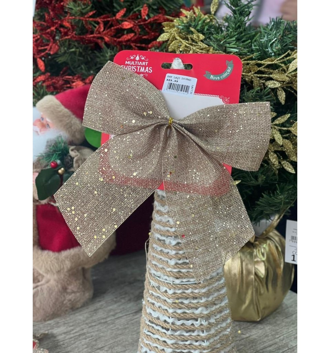 O nosso Enfeite de Natal em forma de Laço Dourado com Glitter é a maneira ideal de trazer um brilho festivo à sua decoração. Seu laço Dourado reluzente e o brilho sutil de glitter adicionam um toque especial à sua árvore ou guirlanda.