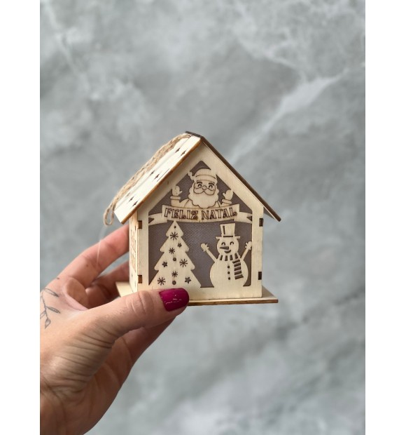 Casinha de Madeira com Luz -"Papai Noel,Árvore e Boneco de Neve"