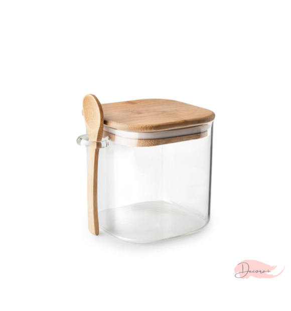Pote de Vidro com Tampa e Colher de Bambu Quadrado - 450ml