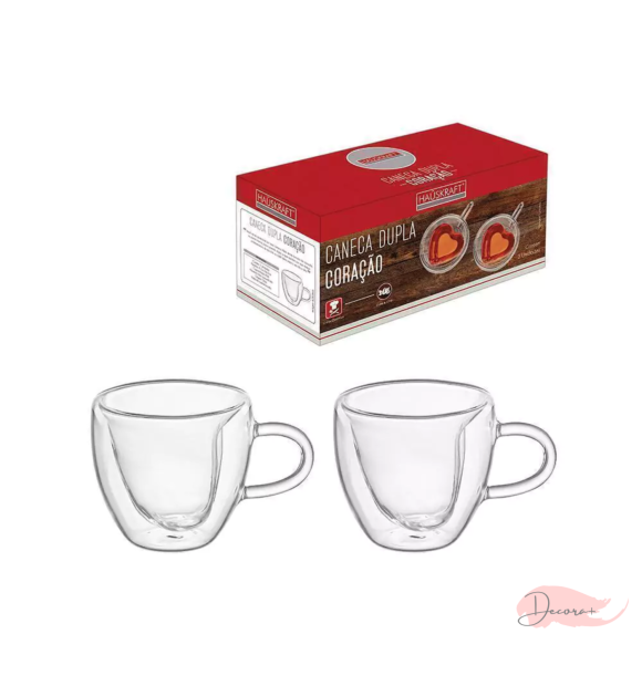 Produto ideal para demostrar a paixão que os brasileiros têm pelo café. O Jogo de Canecas de Vidro Parede Dupla Coração é composto por 2 unidades com capacidade para 80ml cada.
