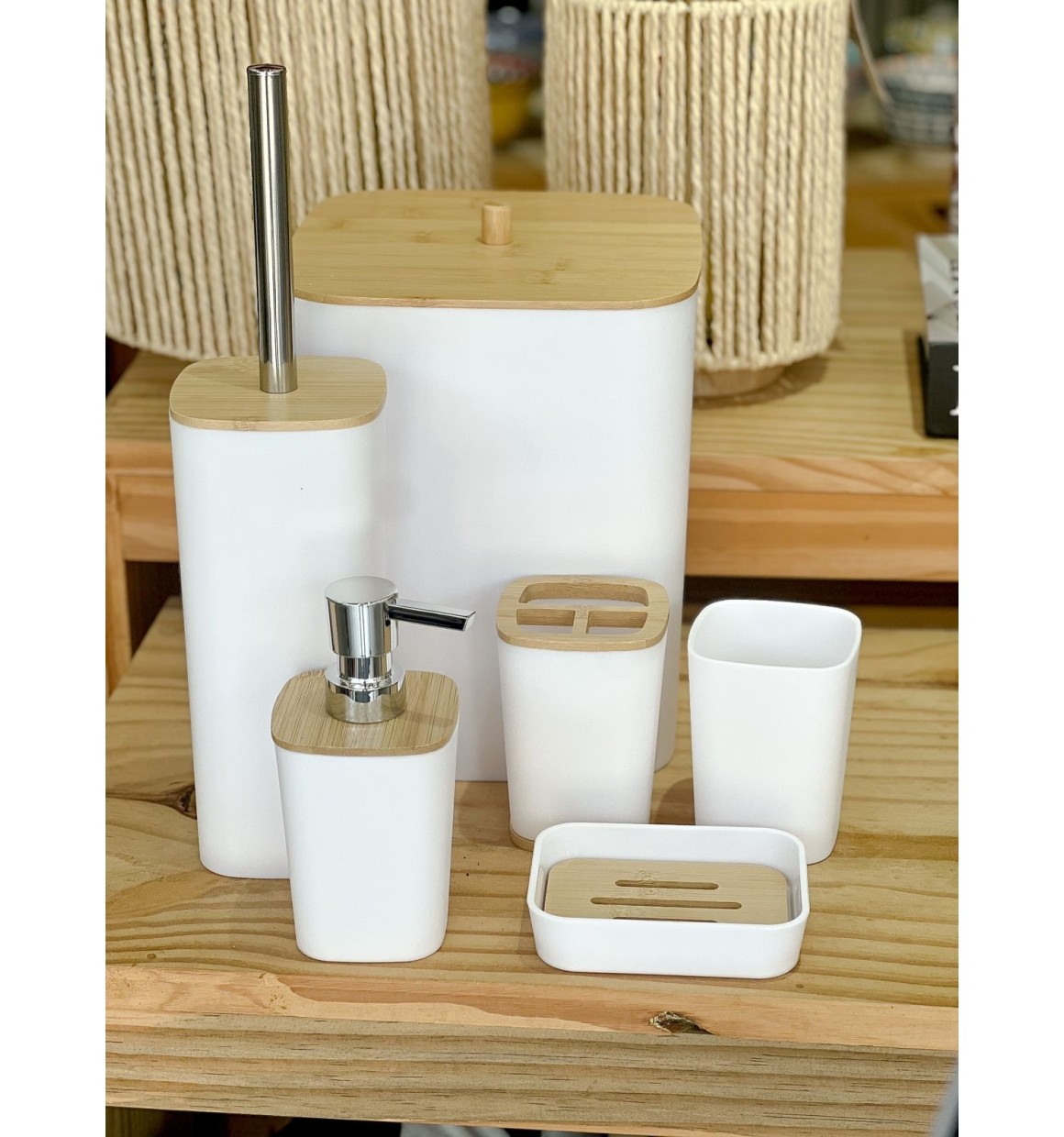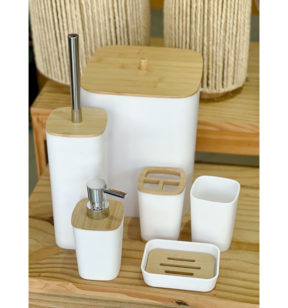 Contém: 1 Porta Sabonete Liquido ,1 Porta Objetos Multiuso,1 Copo Multiuso,1 Saboneteira ,1 Escova Sanitária, 1 lixeira