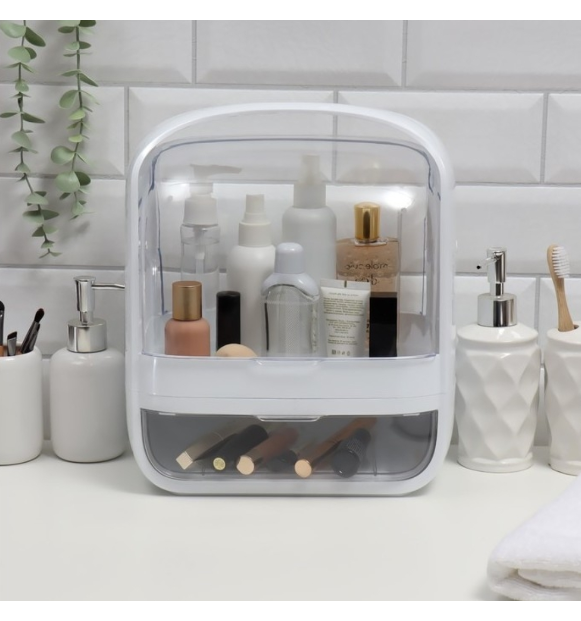 Fácil de acessar: a tampa transparente para manter seus cosméticos longe de poeira e água. Há uma gaveta que pode ser utilizadas para escovas, joias, batom, e mantém a bagunça longe na bancada. O acesso mais rápido aos seus cosméticos ajuda a proporcionar uma rotina de maquiagem eficiente e evita que crianças ou animais de estimação tenham acesso.