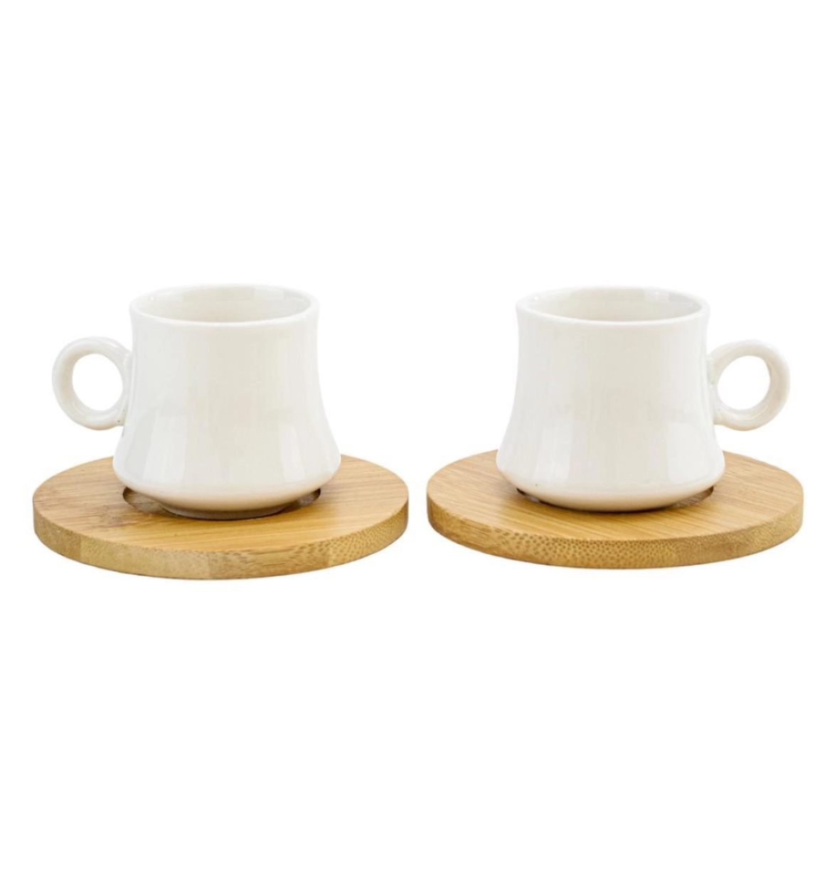 Conjunto de Xícaras Porcelana com Pires Bambu Nordic, composto por 2 xícaras Brancas com Dourado e 2 Pires de Bambu.