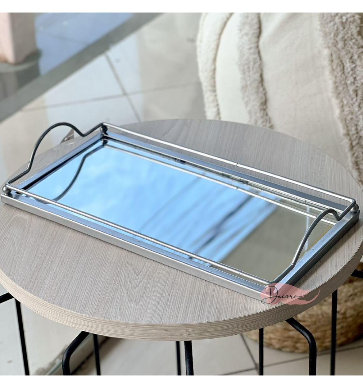 esta bandeja retangular com alças é ideal para servir, organizar ou decorar. O acabamento Prata e o espelho refletem luz e elegância, tornando-a uma peça indispensável para qualquer ambiente sofisticado.