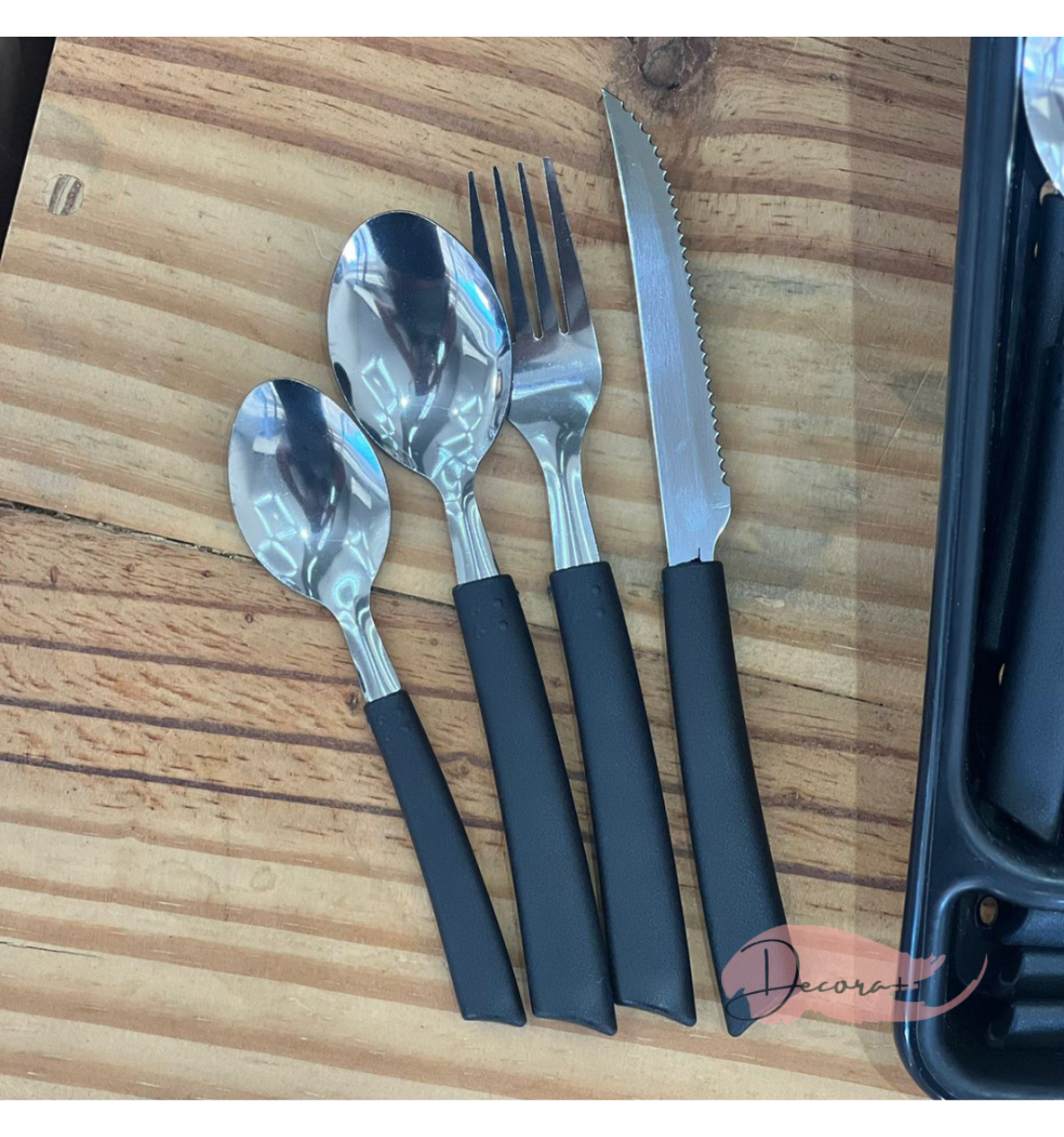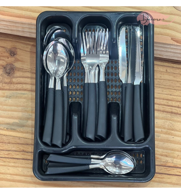 Contém: 6 garfos +6 facas + 6 colheres de sopa + 6 colheres de chá + 1 Porta Talheres