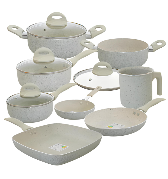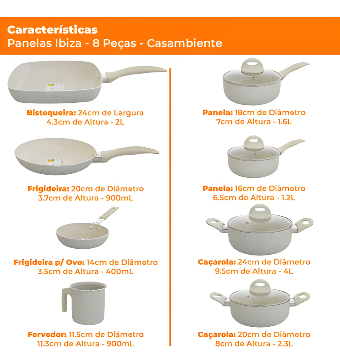 O Conjunto Casambiente 8 peças é indicado para fogões a gás, vitrocerâmico ou elétrico, é composto por duas caçarolas, duas panelas com cabo, uma frigideira, uma frigideira para ovo, uma bistequeira e uma leiteira, todos em alumínio na cor vanilla com revestimento cerâmico preto marble.