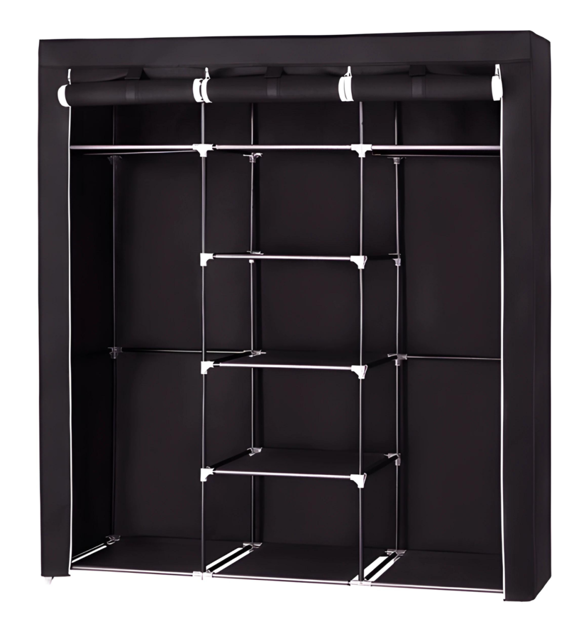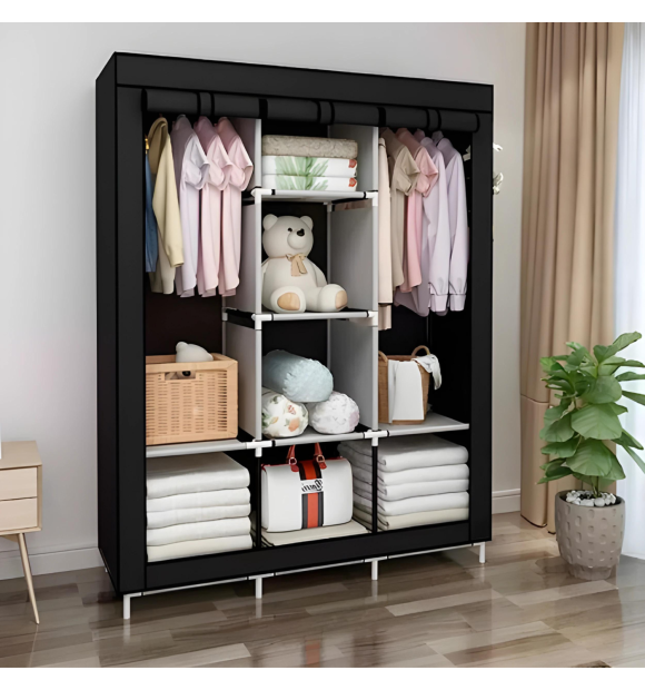Este armário prático de tecido dobrável possui três divisões verticais, dois amplos espaços com cabideiro e 8 prateleiras. Equipado com cortina de rolo, abre e fecha facilmente através do fechamento com zíper.