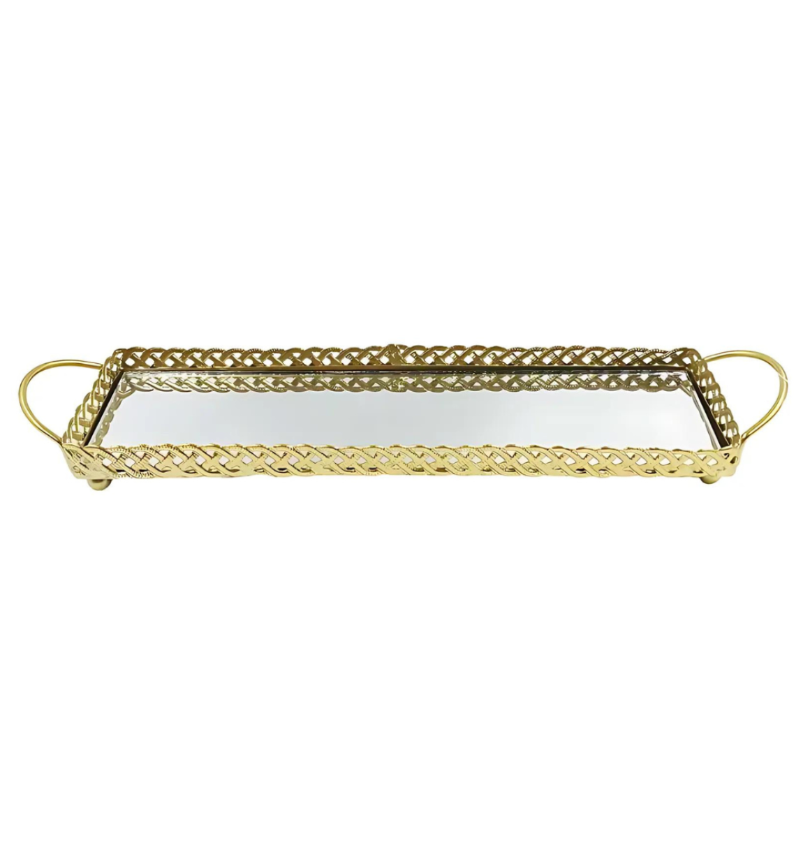 Descubra a elegância e funcionalidade desta bandeja dourada espelhada. Com um design retangular e alças práticas, ela é perfeita para servir drinks, organizar perfumes ou decorar qualquer ambiente, refletindo sofisticação e charme.
