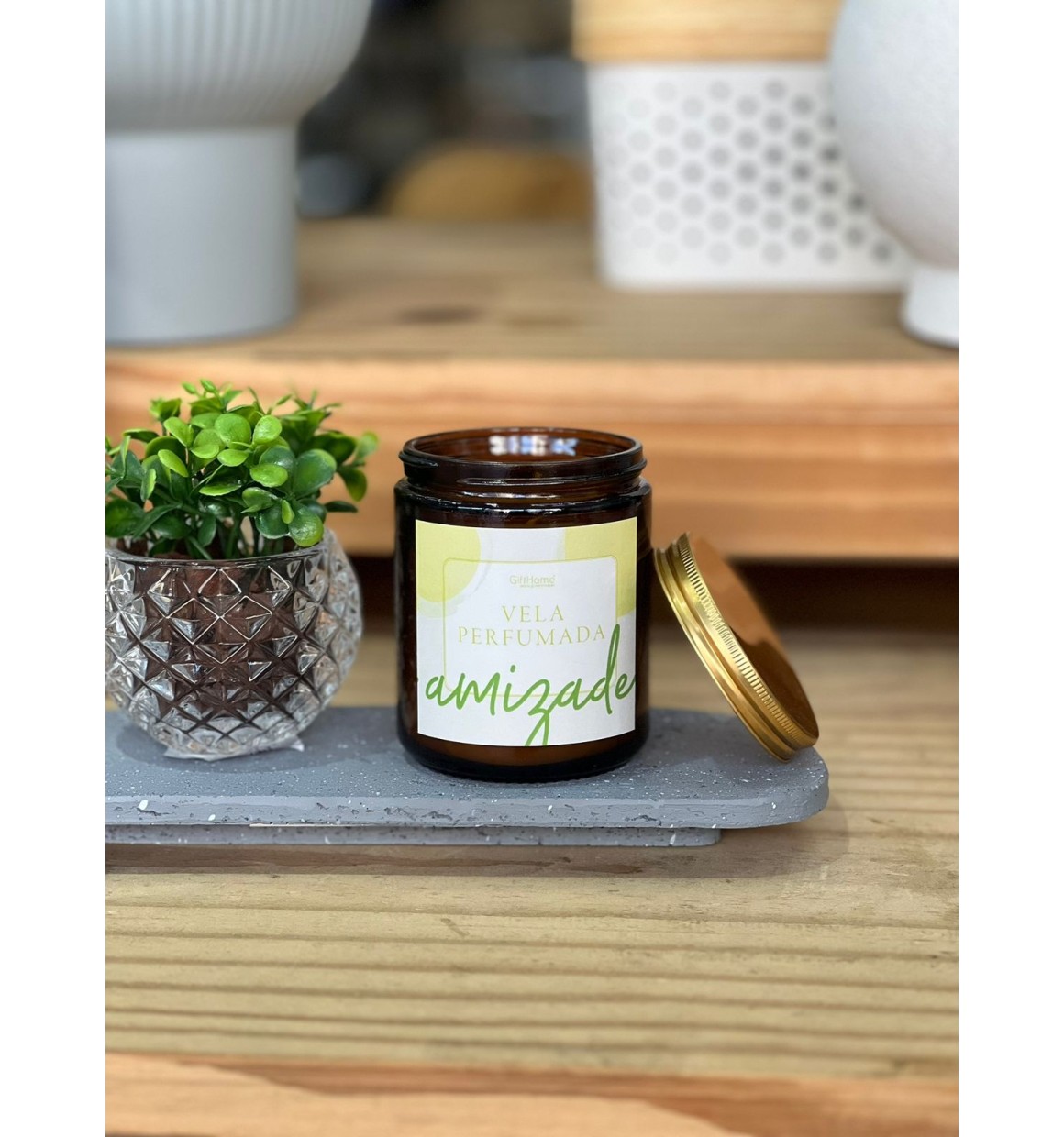 Desfrute do aroma suave e sofisticado da Vela Branca com fragrância de Lichia e Chá. Com uma mensagem inspiradora de "AMIZADE" gravada no frasco de vidro âmbar de 7cm x 9cm, esta vela é perfeita para criar um ambiente acolhedor e especial.