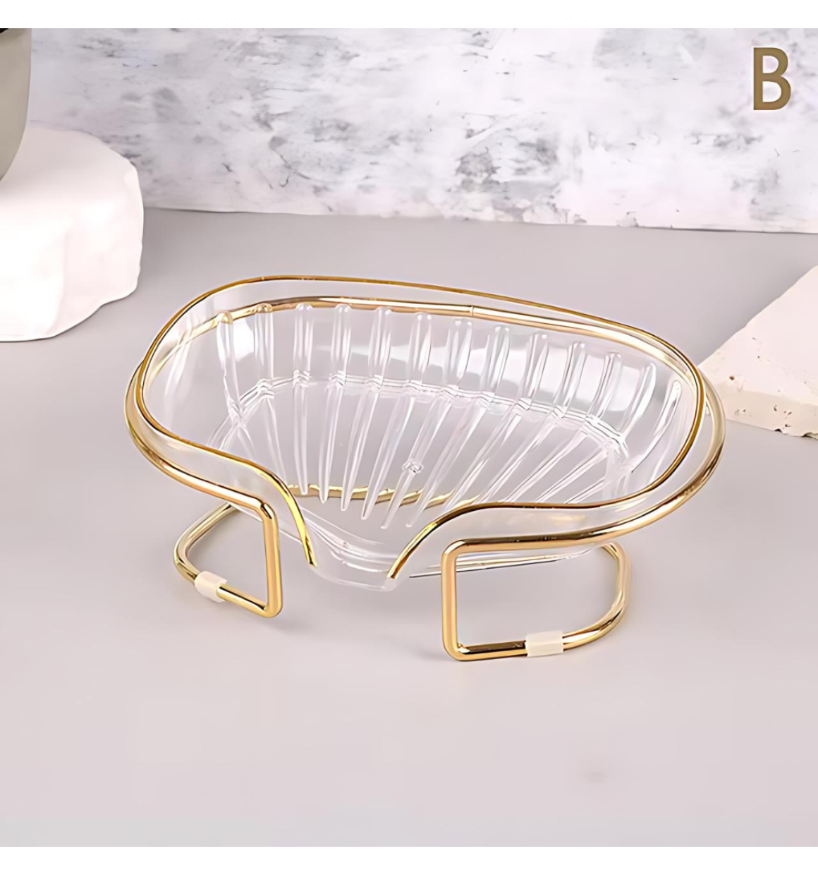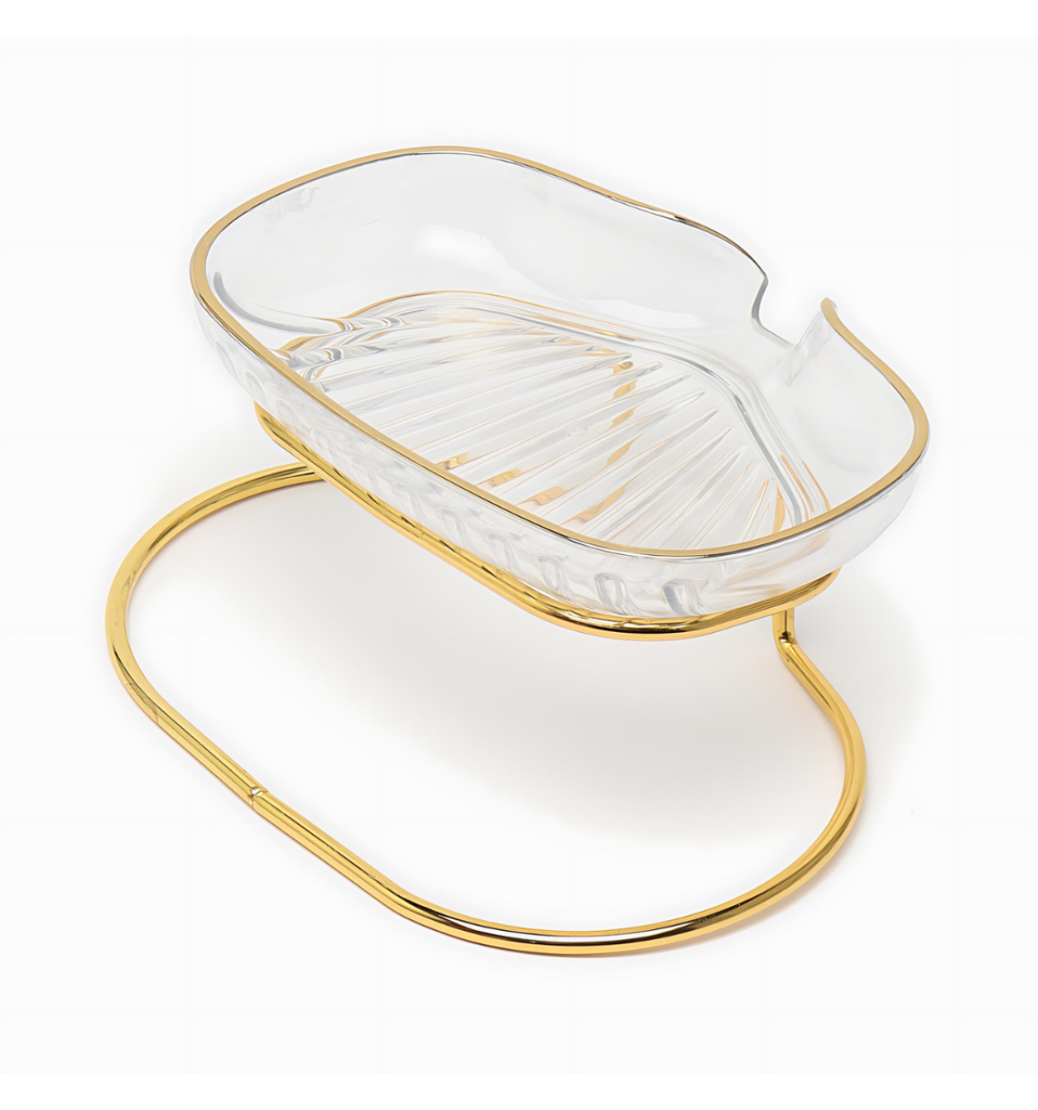 2. Saboneteira de Acrilico c/ Suporte em Metal Dourado - Transparente