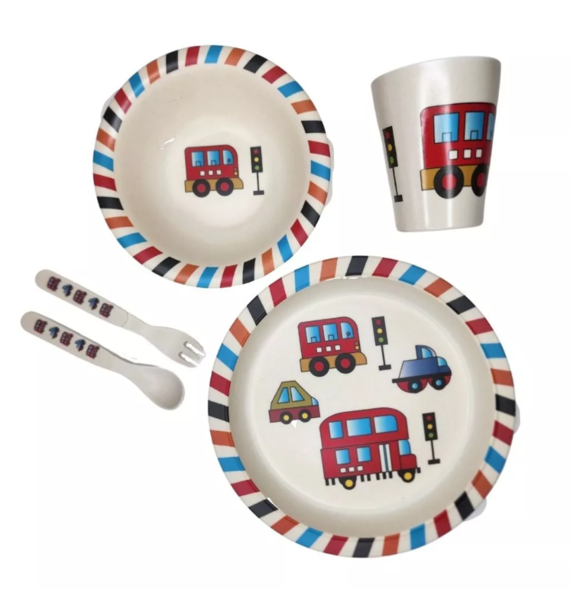 1 prato com divisórias 21cm, 1 tigela 14cm ,1 copo 9,5cm 1 garfo e 1 colher de 13cm .