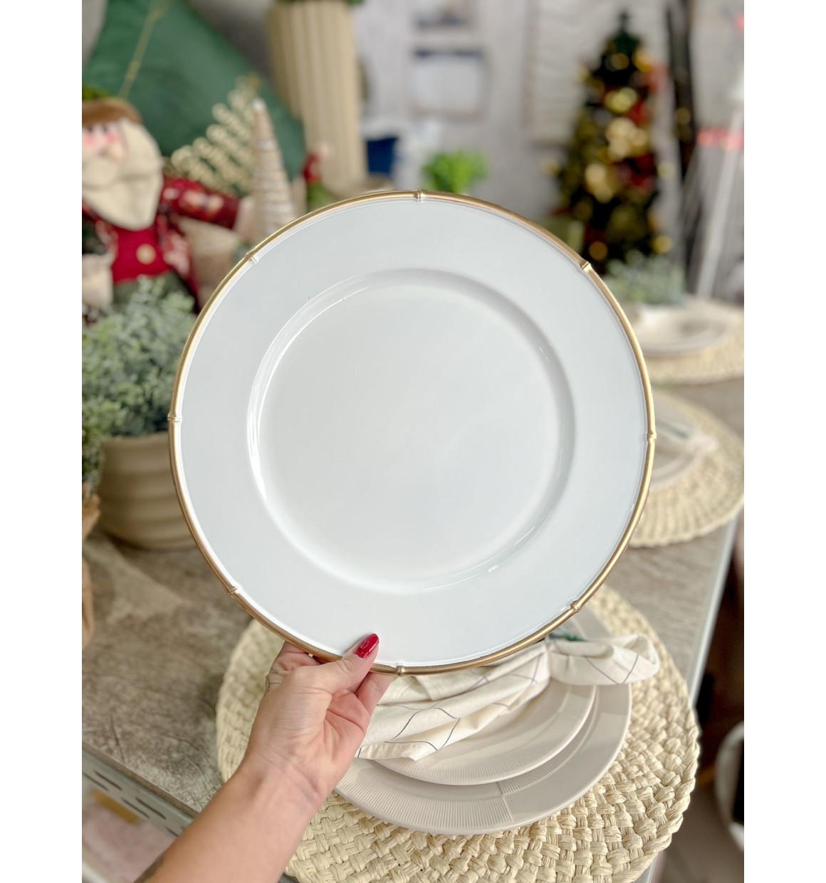 Deixe suas celebrações e encomendas ainda melhores com o Sousplat Redondo Branco com Dourado. Com esse sousplat você pode servir tortas, bolos, docinhos, bombons, trufas e até salgados. Além disso, você pode usá-lo para colocar pratos ou bandejas por cima, deixando sua mesa ainda mais bonita para qualquer ocasião.