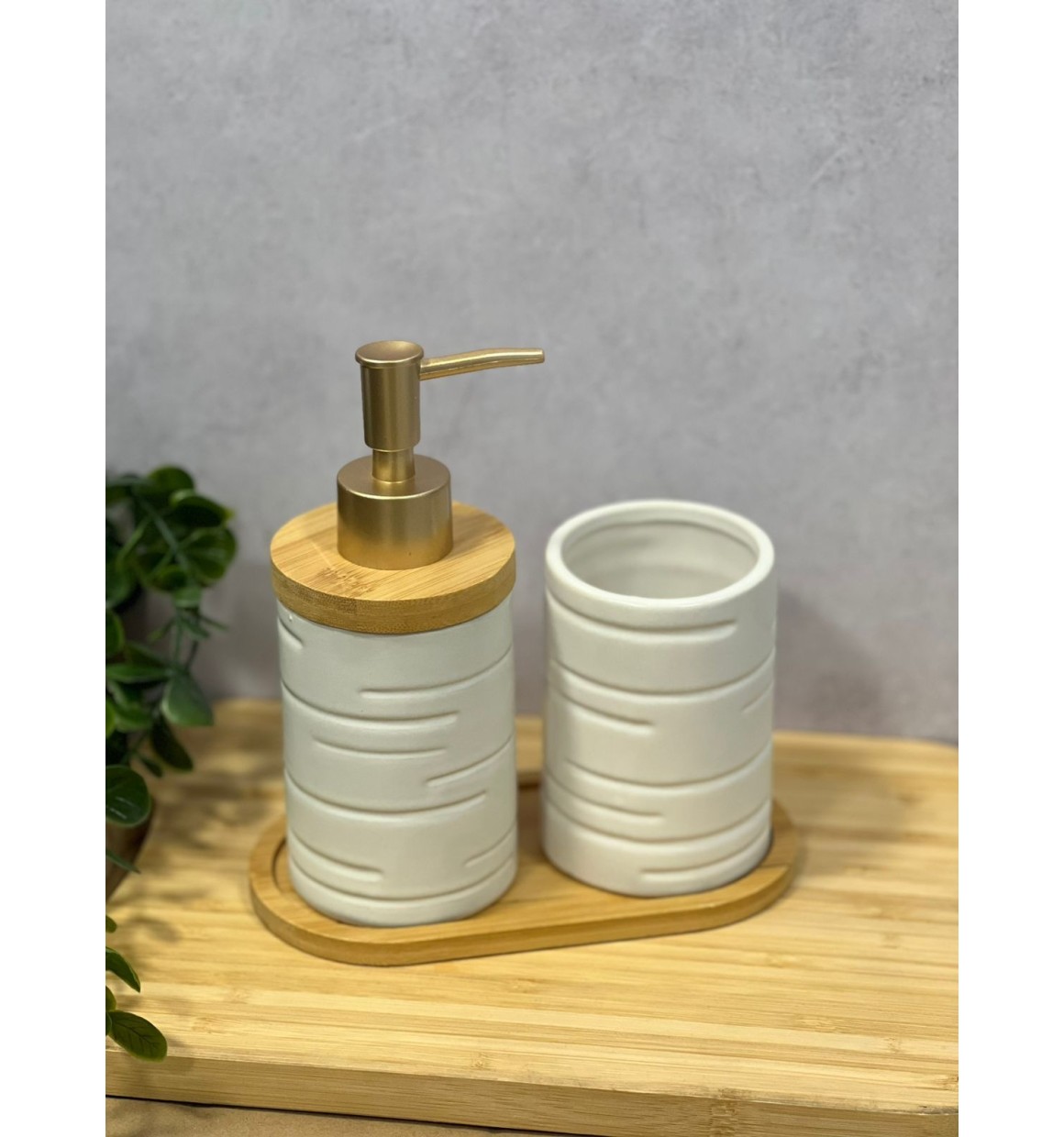 Kit de Banheiro Branco de Porcelana e Bambu - 3 Peças