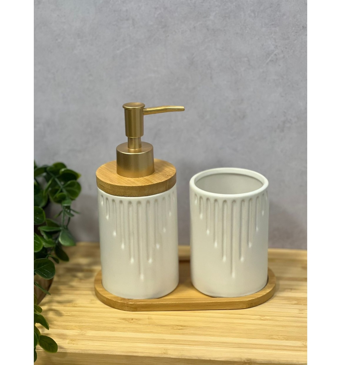 2. Kit de Banheiro Branco de Porcelana e Bambu - 3 Peças