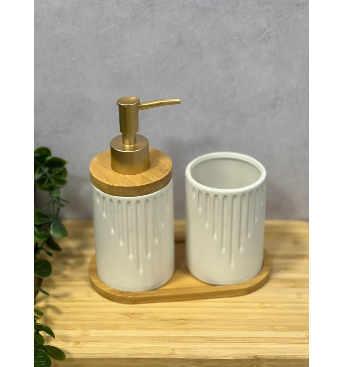 Kit de Banheiro Branco de Porcelana e Bambu - 3 Peças
